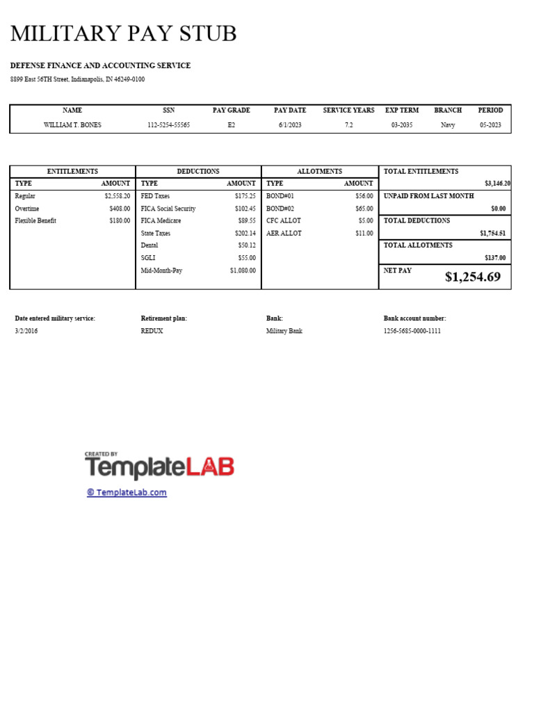 Military paystub Word and PDF example Pretempl