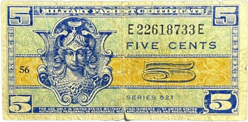 Five Cent Military Payment Certificate Series 521 Good Color