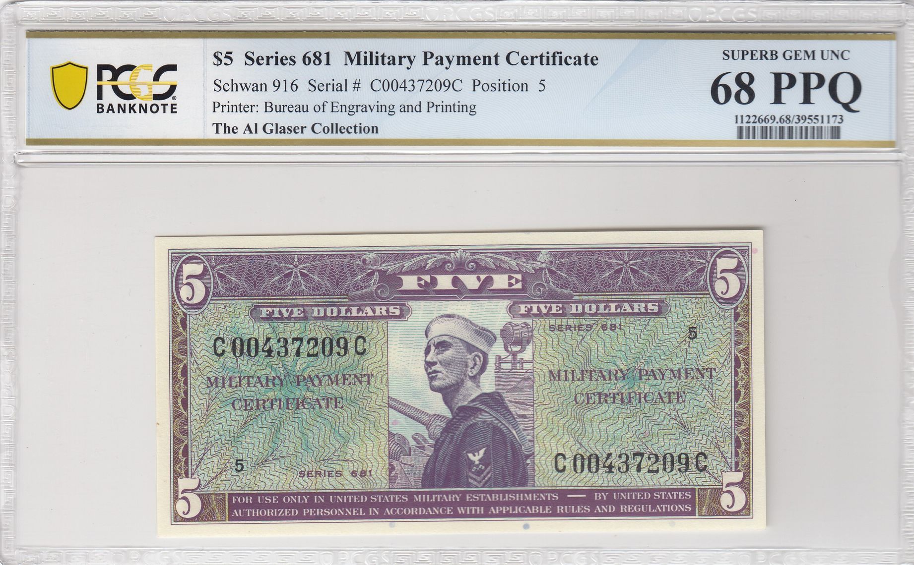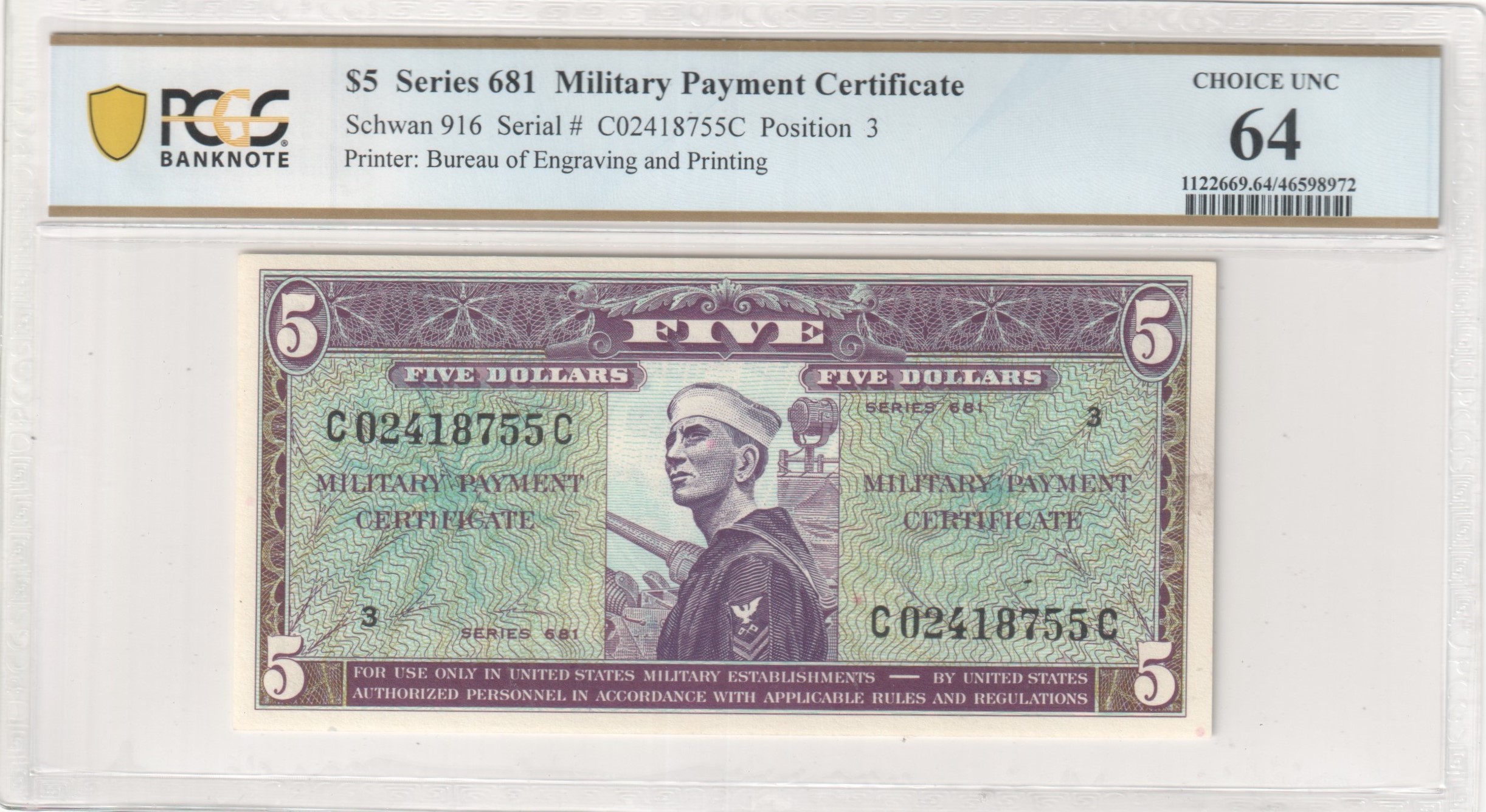 Military Payment Certificate Series 681 $5 dollars Schwan 917 PCGS 30
