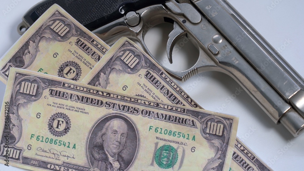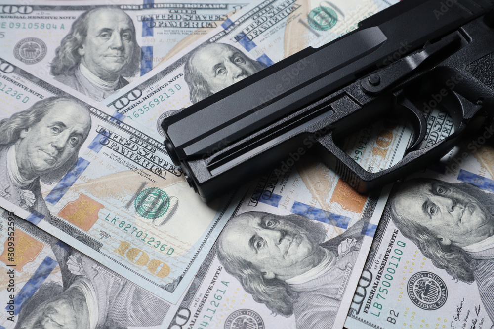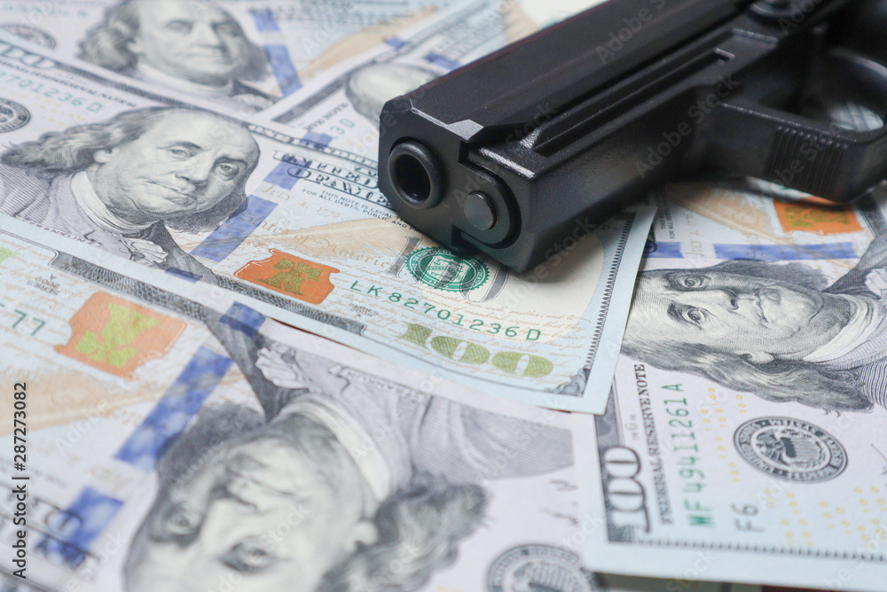 Pistol gun on 100 us dollar banknote illegal money by gangster dirty