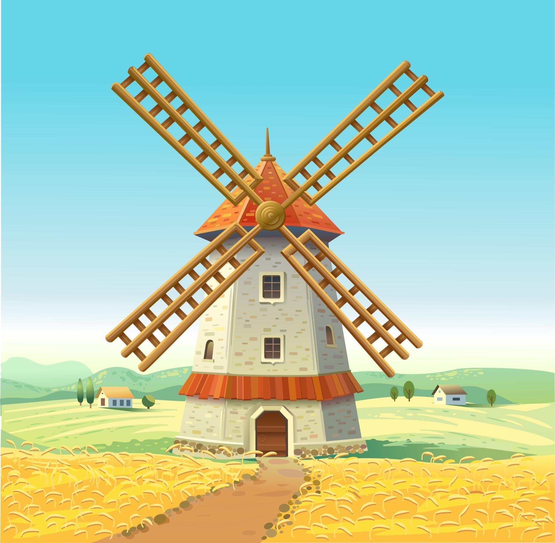 Mill on a sunny field Wooden Mill Wheat field Vector illustration