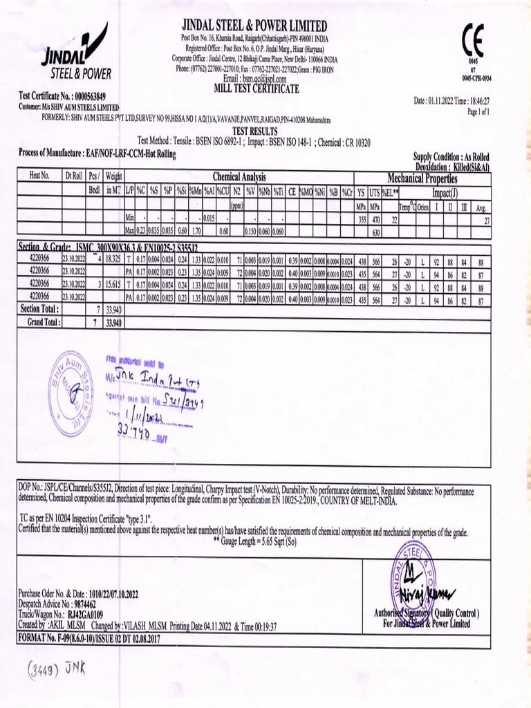 Mill Test Certificate for Steel Products from Jindal Steel Power
