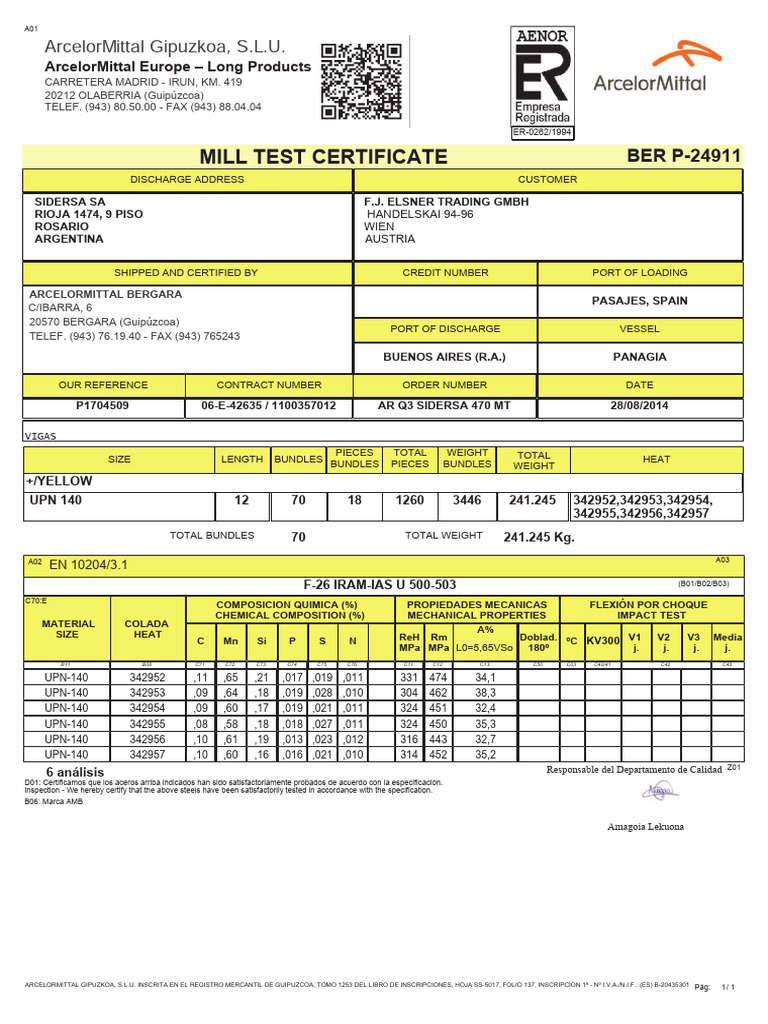 Mill Test Certificate: Arcelormittal Gipuzkoa S L U PDF