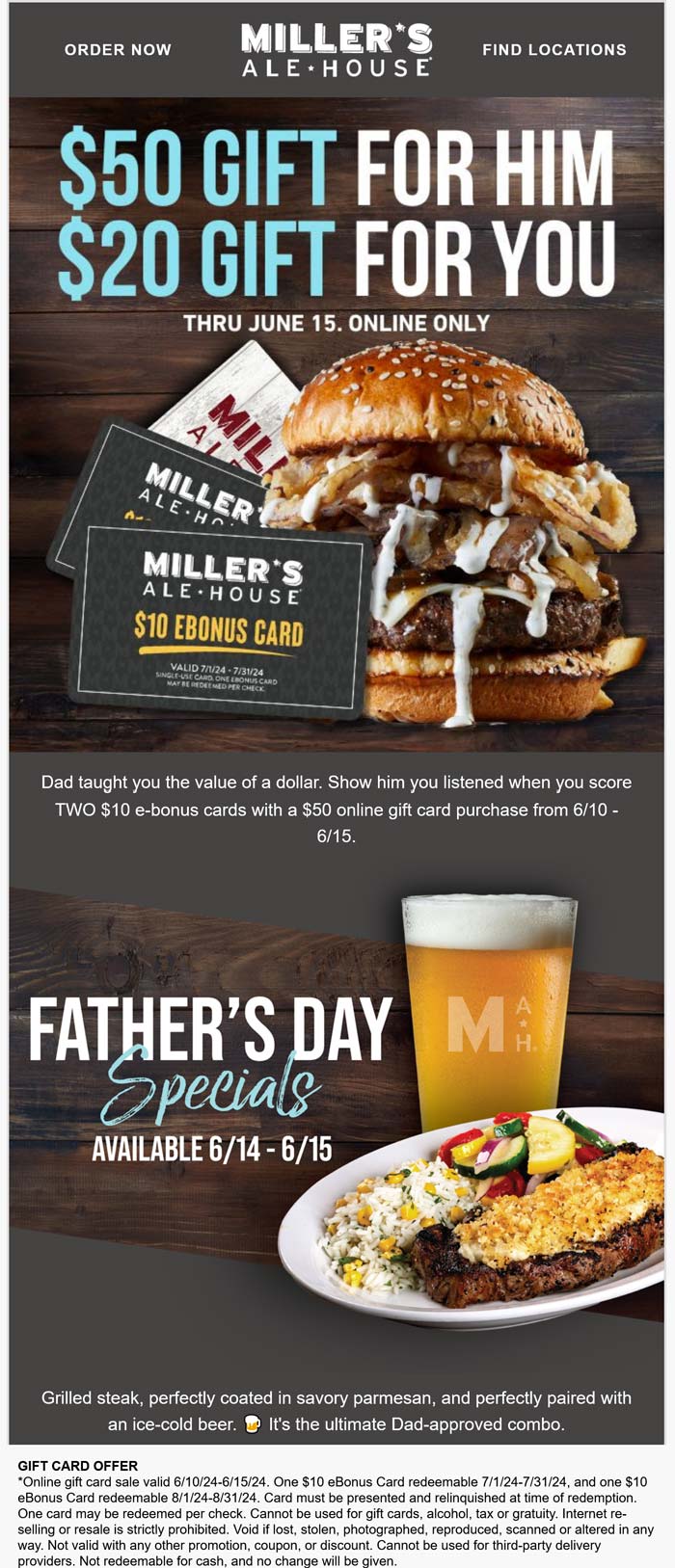 $20 card free with your $50 card at Millers Ale House restaurants #