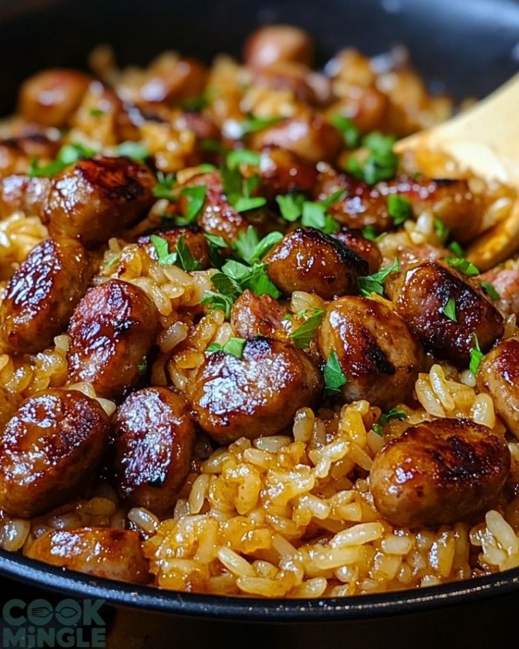 One Pan Sweet and Tangy BBQ Sausage Rice Cook Mingle