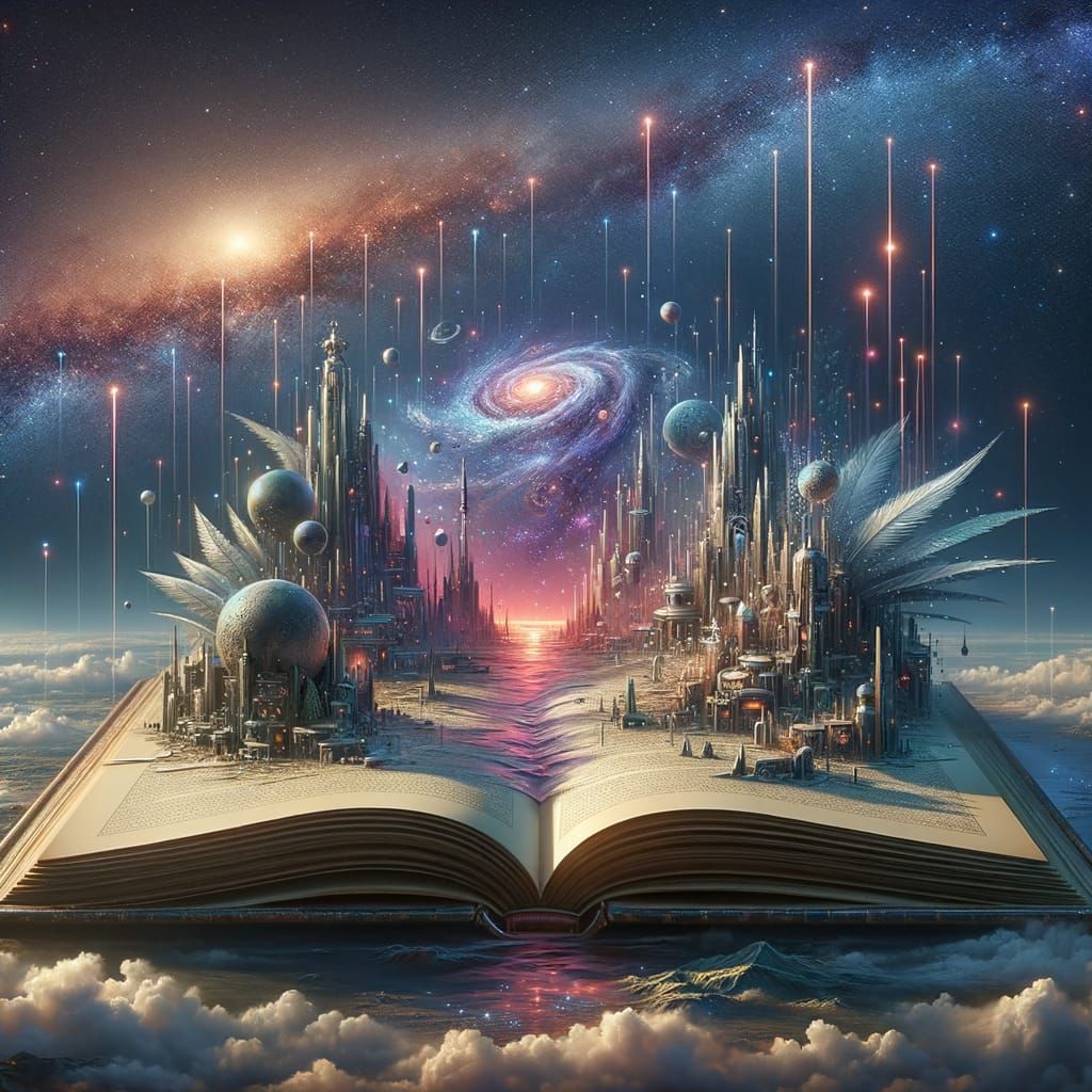 Miniature sci fi world coming out of open book AI Generated Artwork