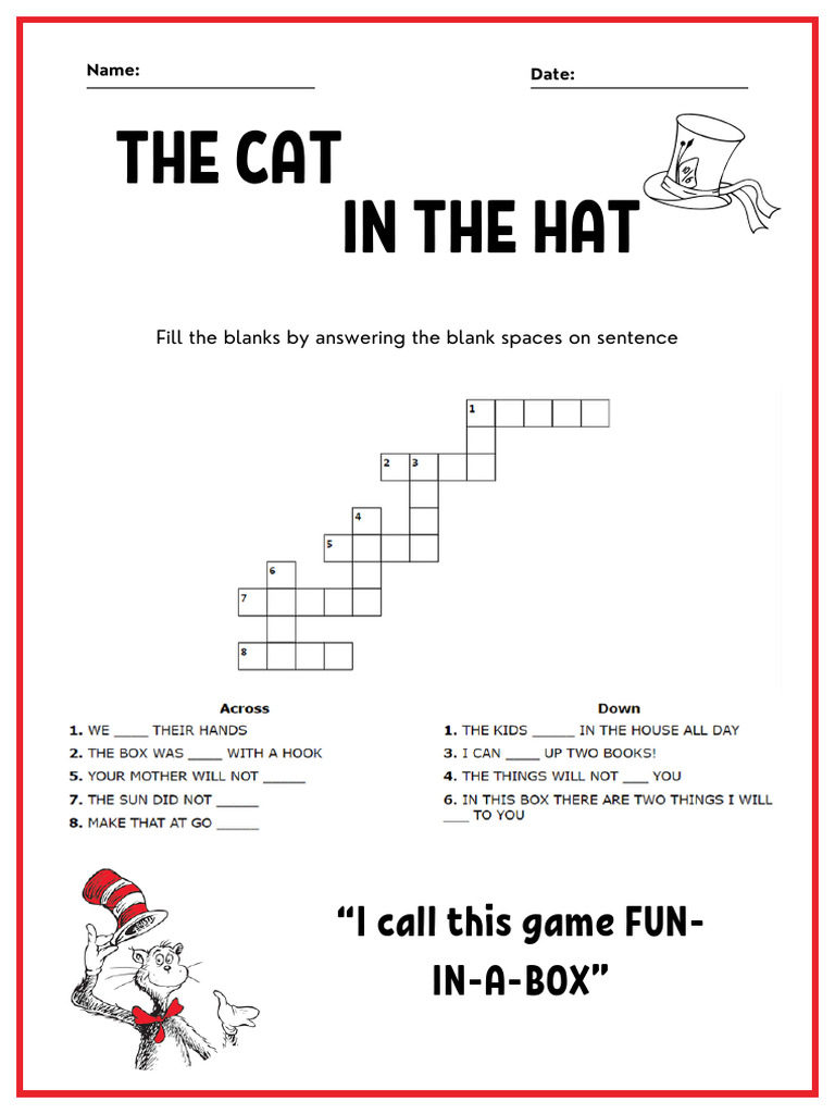 THE CAT IN THE HAT by Dr Seuss crossword puzzle worksheet activity