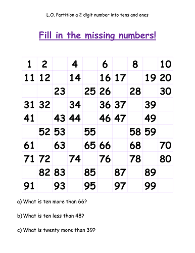 Numbers to 100 Fill in the Missing Numbers Worksheet Digital #1