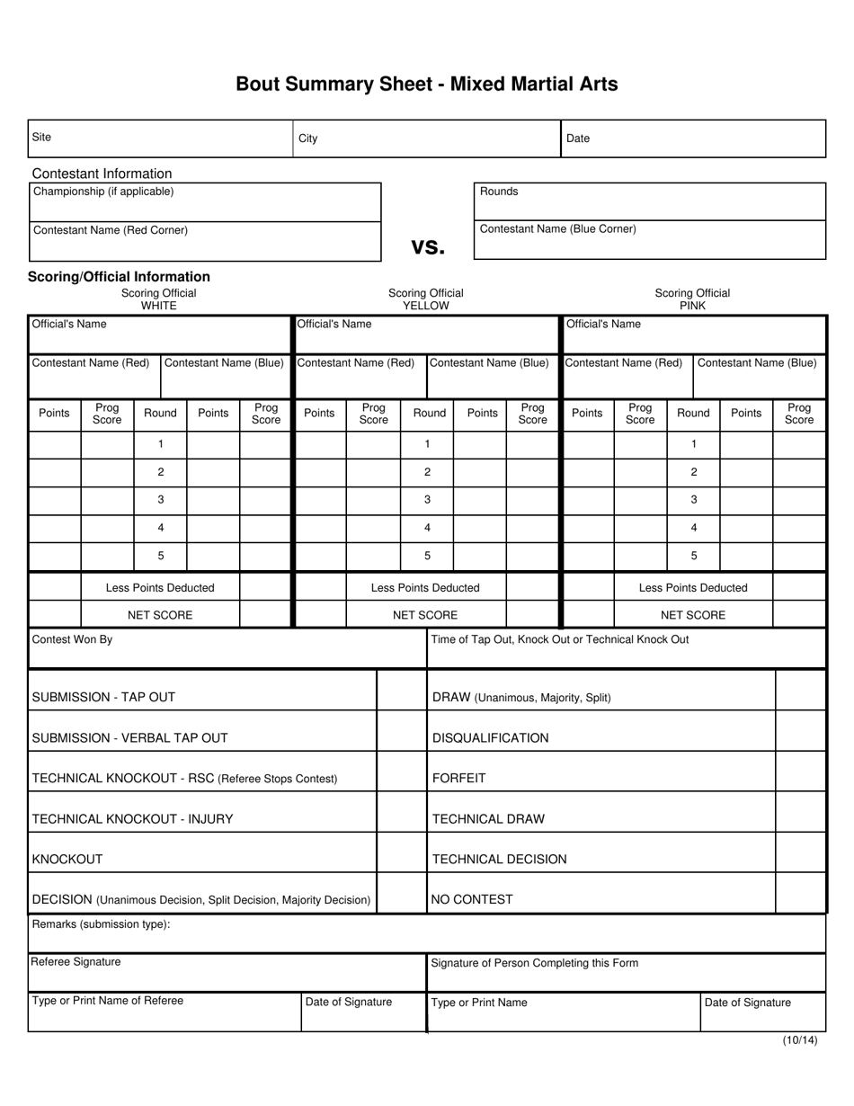 Michigan Bout Summary Sheet Mixed Martial Arts Fill Out Sign