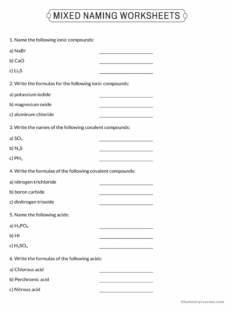 Mixed Naming Worksheet: Ionic Covalent and Acids Practice Course Hero