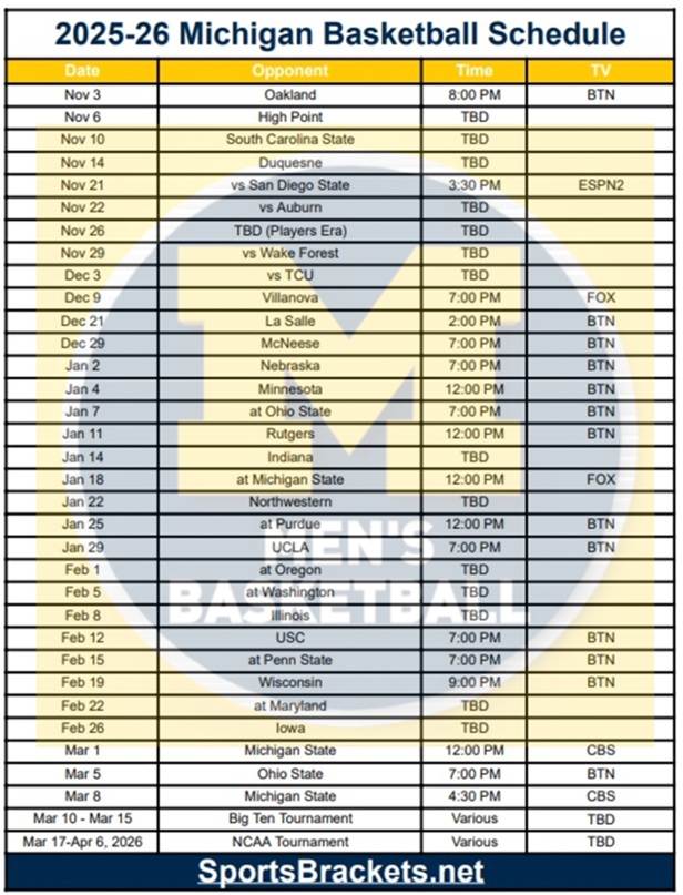 Printable 2025 26 Michigan Basketball Schedule PDF format TV