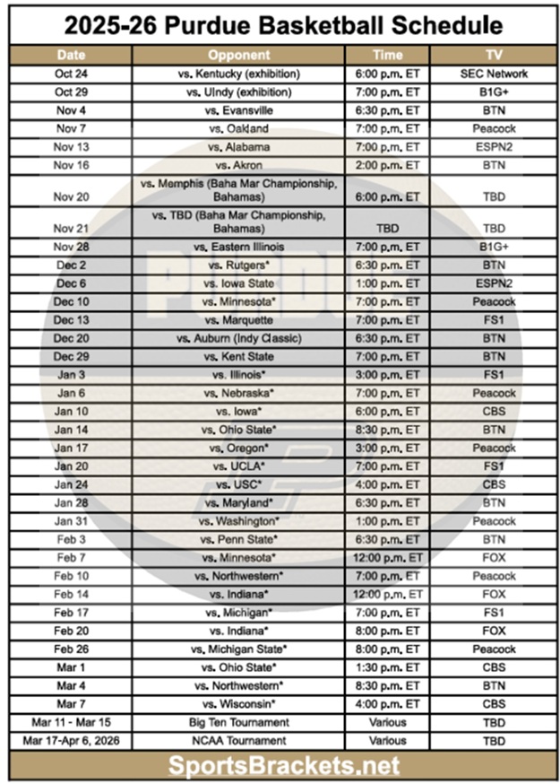 Printable 2025 26 Purdue Basketball Schedule PDF format TV Broadcasts