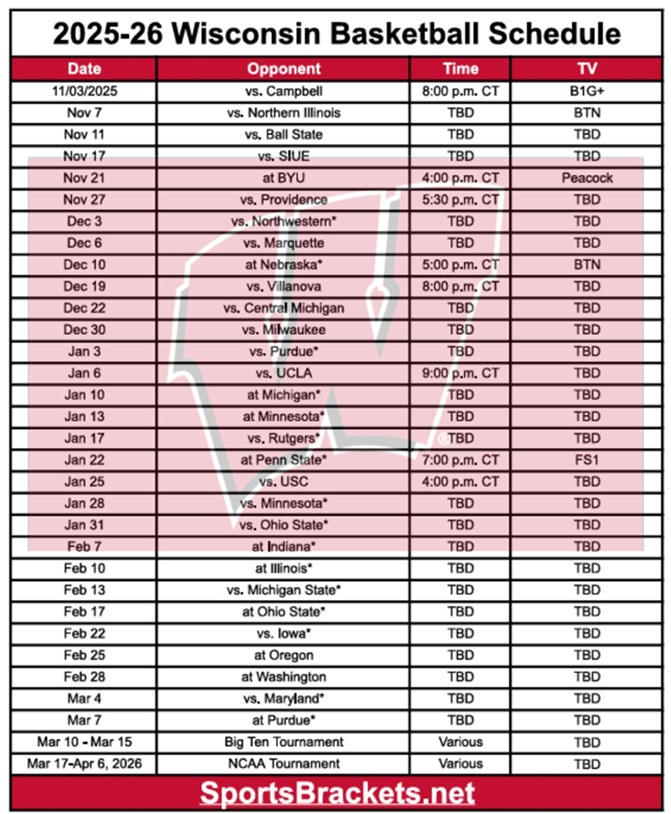Printable 2025 26 Wisconsin Basketball Schedule PDF format TV