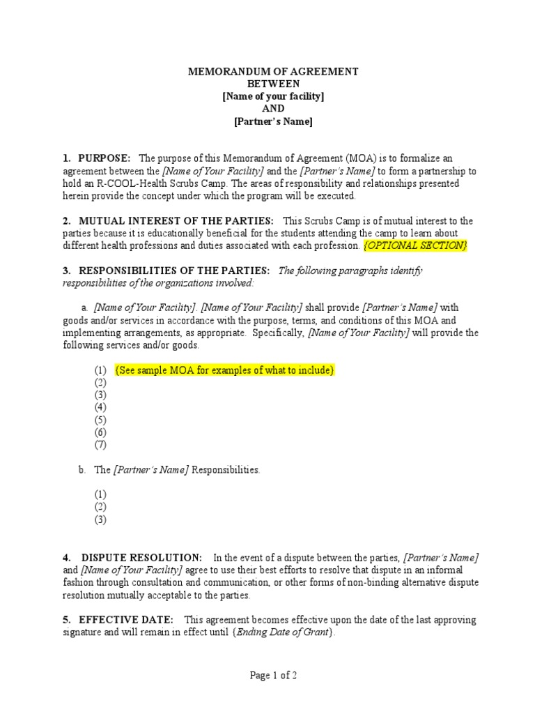 Memorandum of Agreement MOA Template PDF