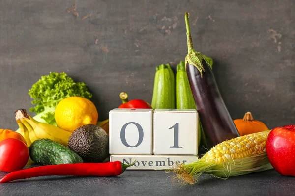 Fresh vegetables fruits and cube calendar with date NOVEMBER 1 on