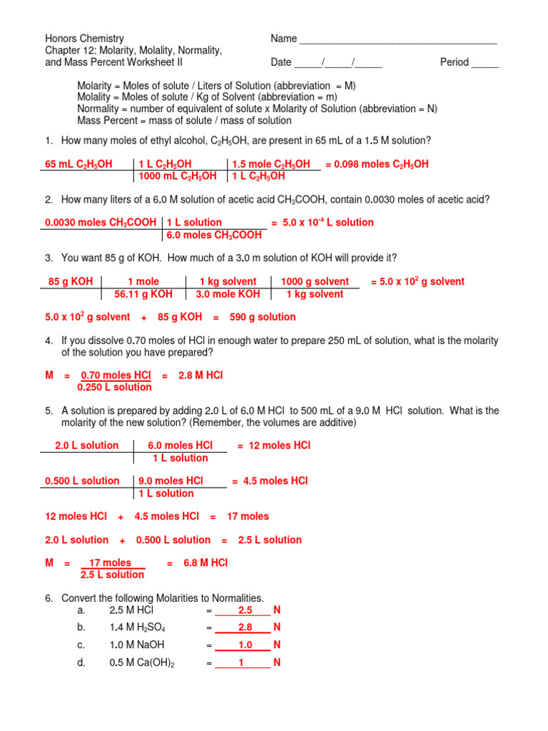 Molarity Molality Normality and Mass Percent Worksheet II Answer Key
