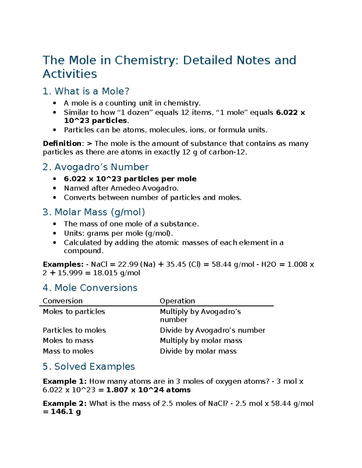 Mole Chemistry Notes: Detailed Study Guide and Activities Studocu