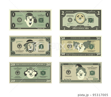 Money Template Print Design of Money with Funny Clown Faces Stock