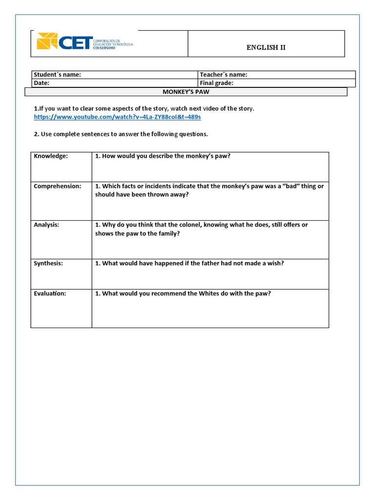 Monkeys Paw Worksheet