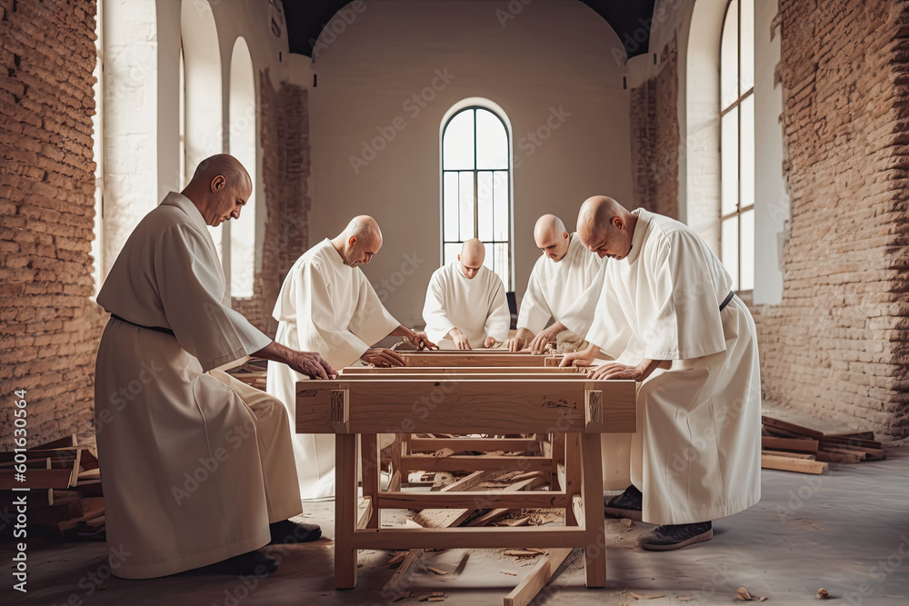 Seven Cathusian monks in white robes with hoods Medieval monks