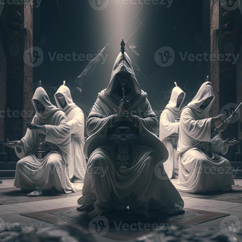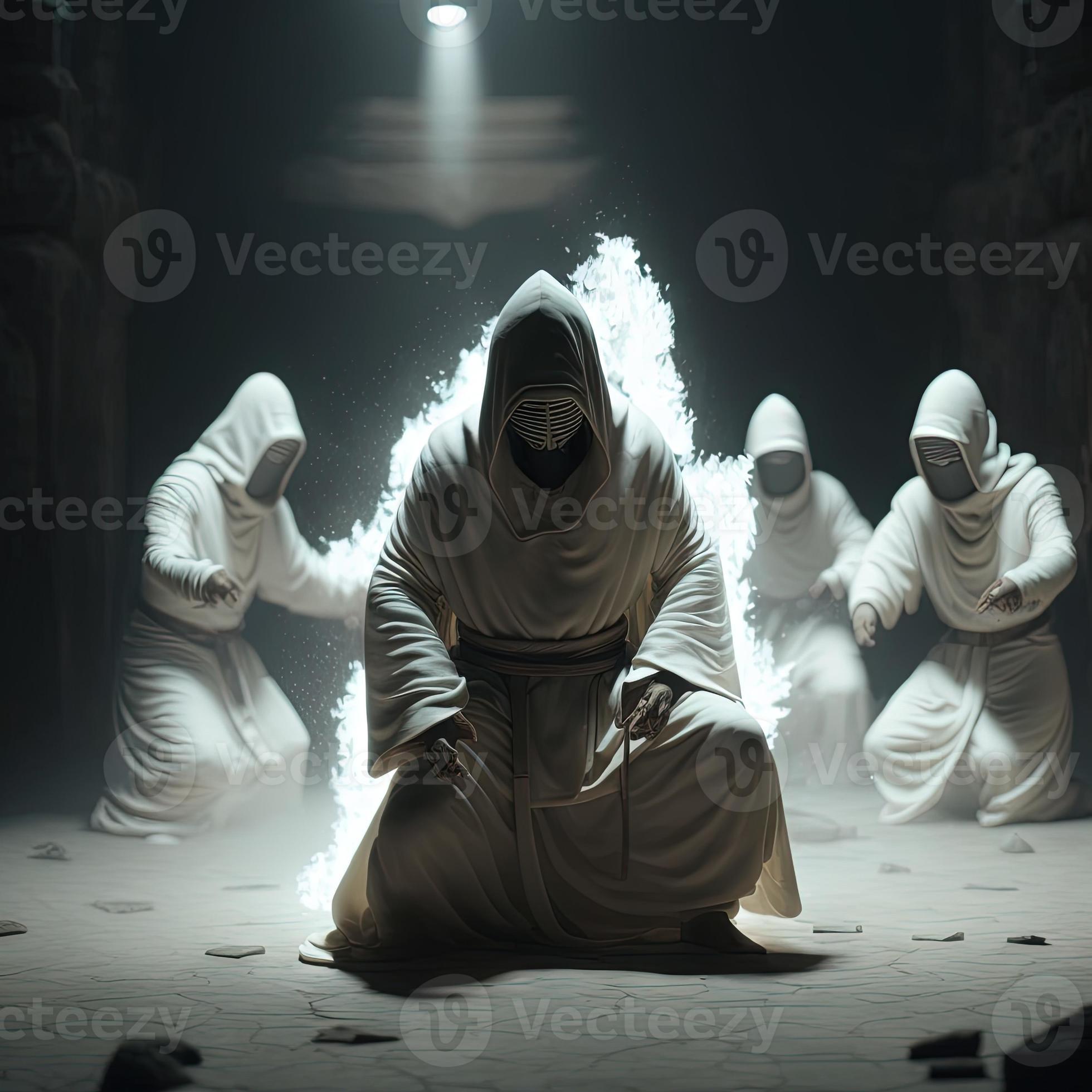 warrior monks in all white robes and hoods meditate 22316269 Stock