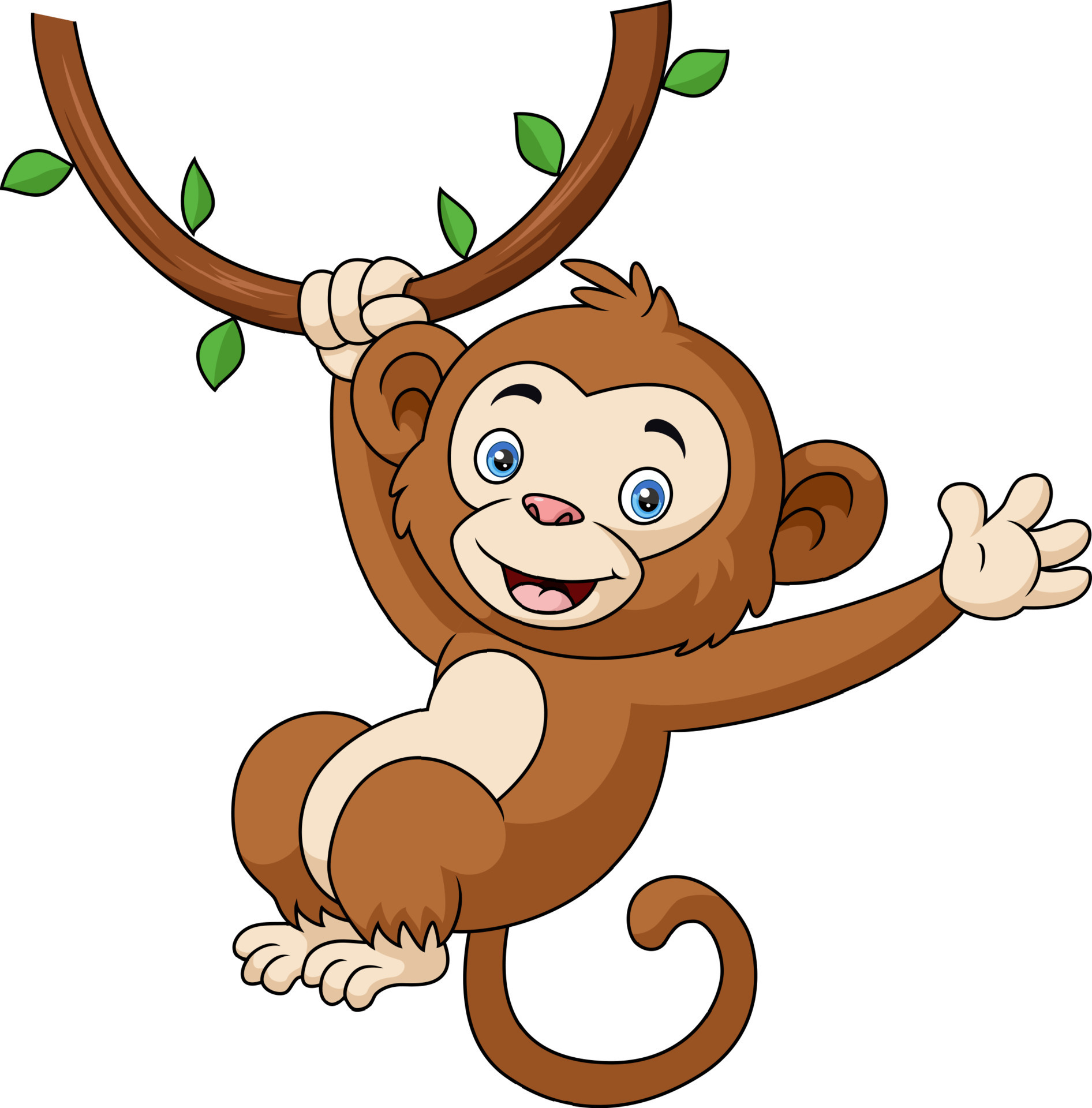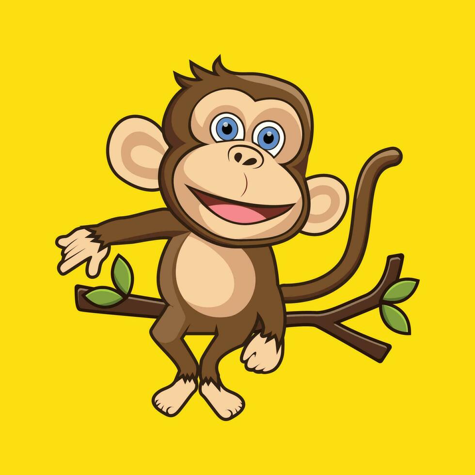 Lindo pequeño mono de dibujos animados colgando de la rama de un árbol