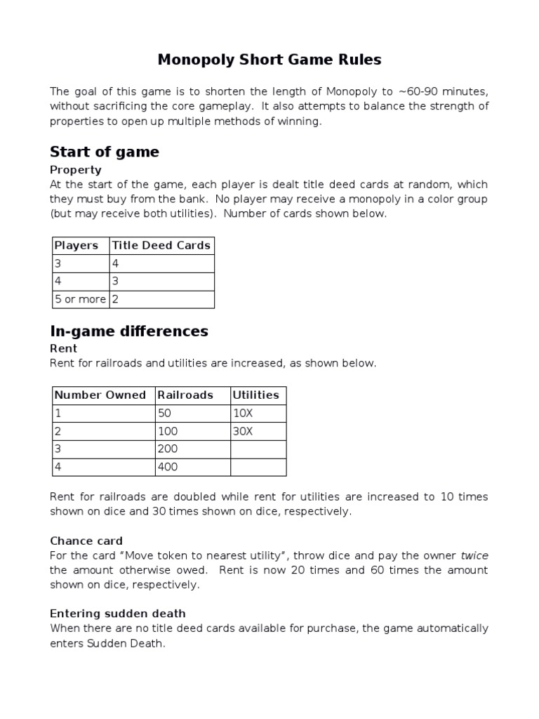 Monopoly Short Game Rules: Property PDF Bankruptcy Personal Finance