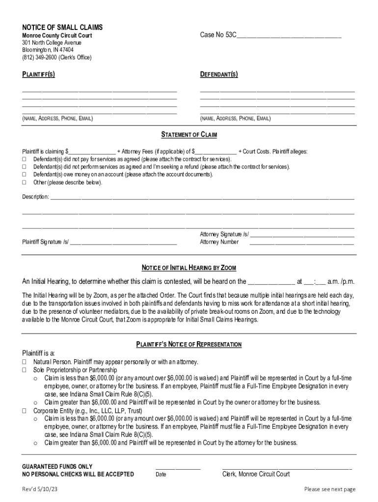 Fillable Online Monroe County Small Claims Department Bloomington Fax
