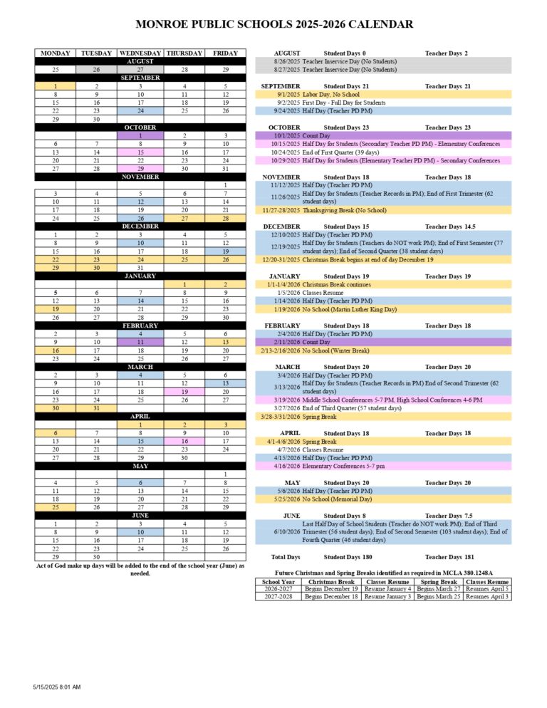 Monroe public schools Calendar 2025 25 Schedule