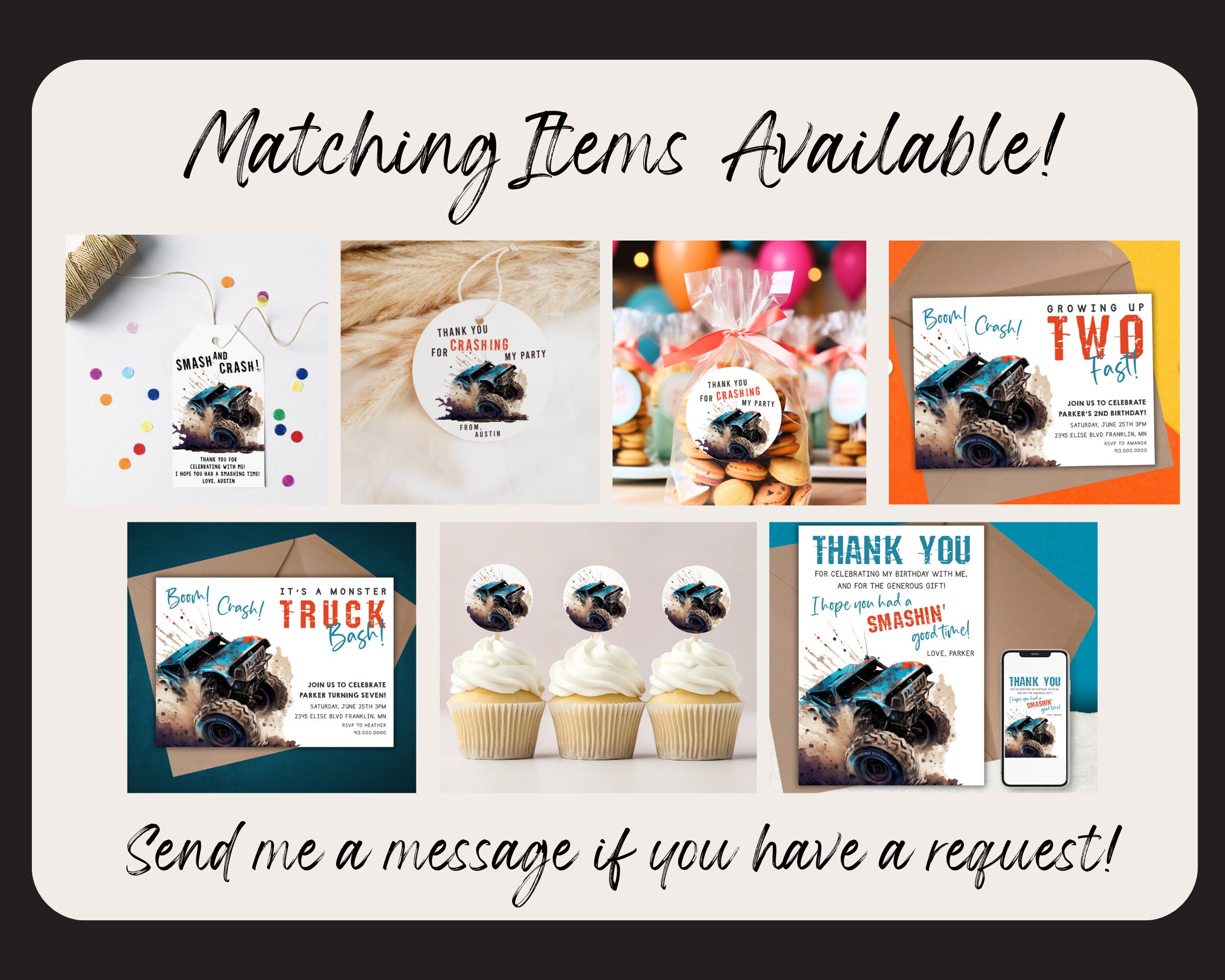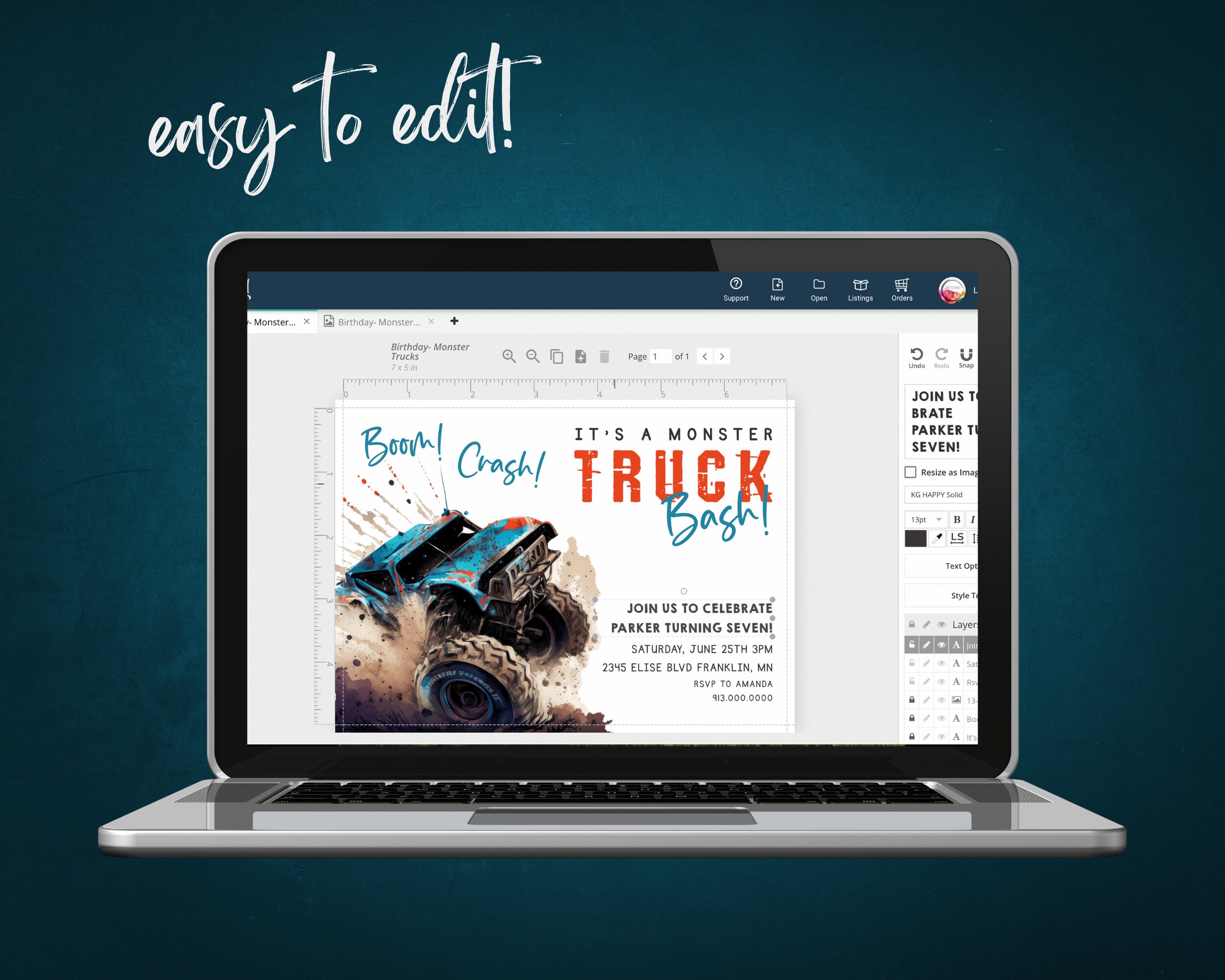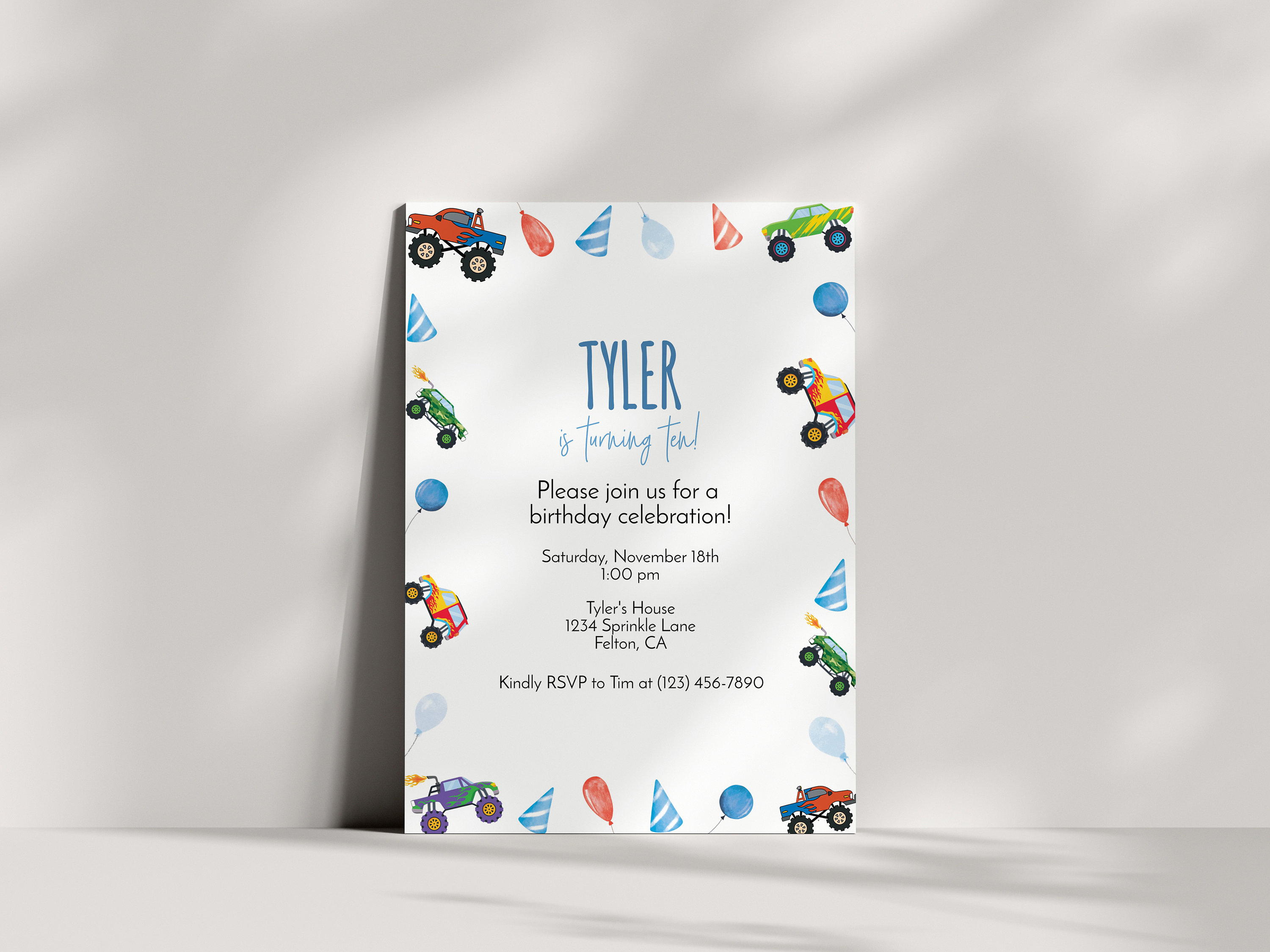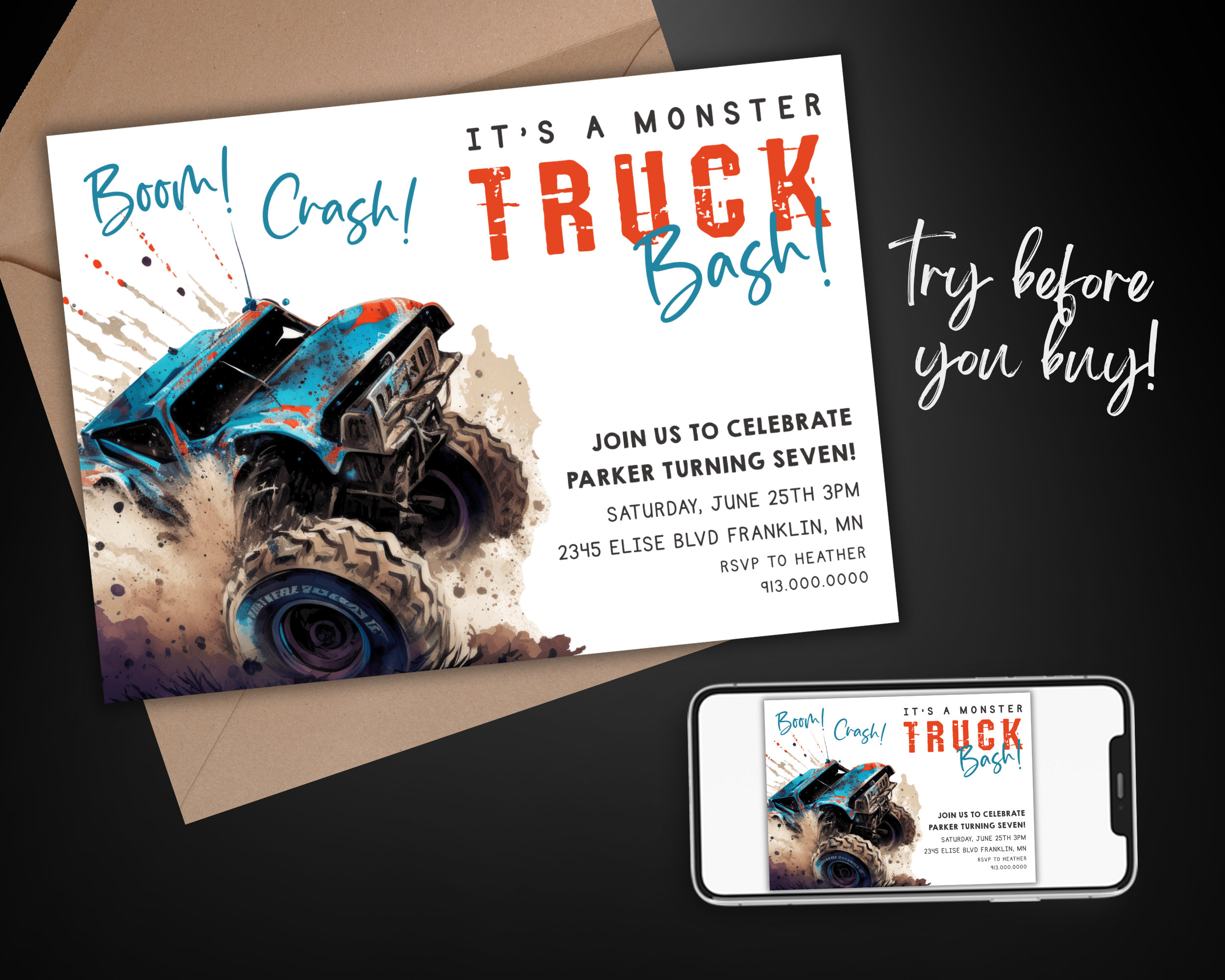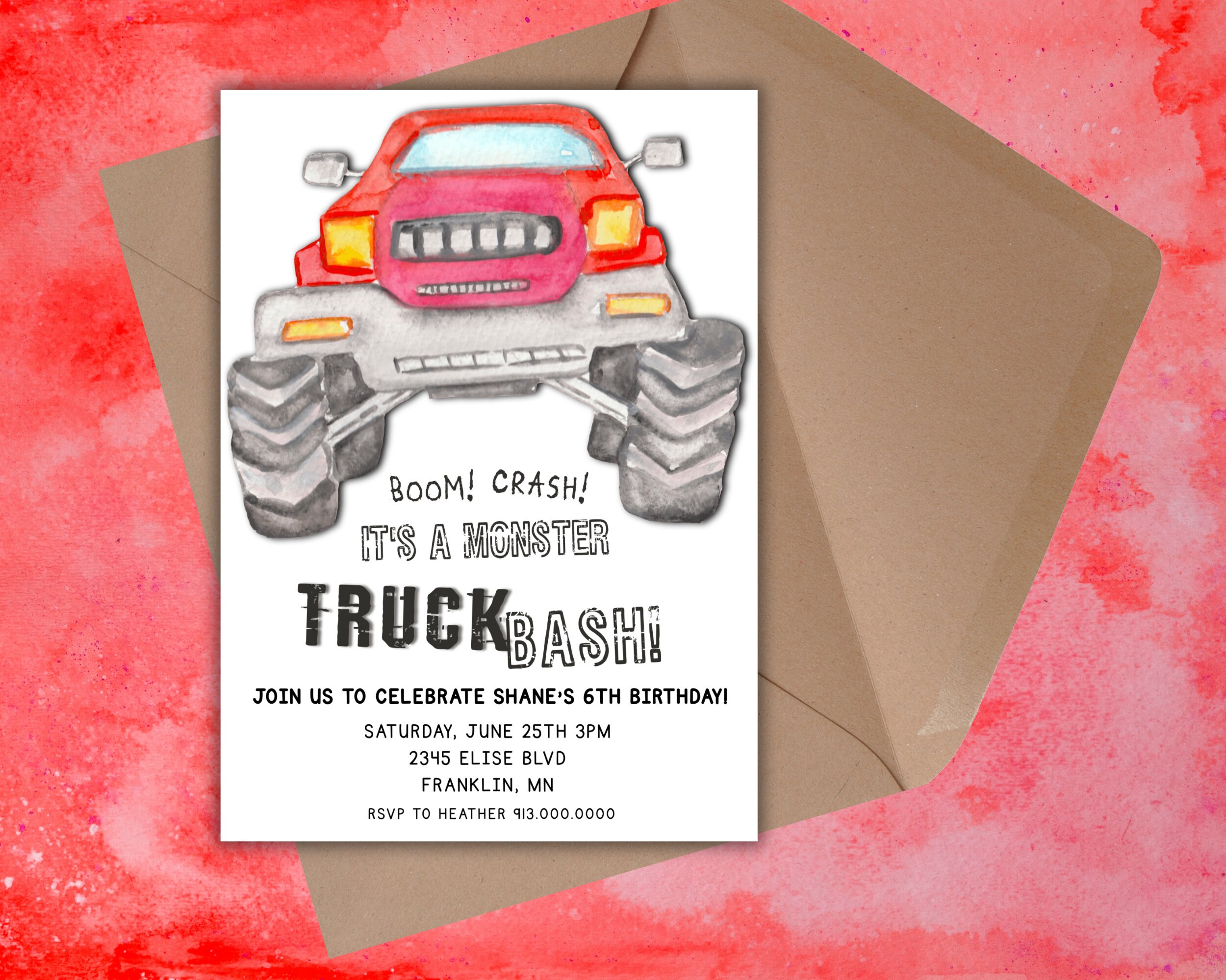 Editable MONSTER TRUCK Party Invitation Birthday Celebration Photo