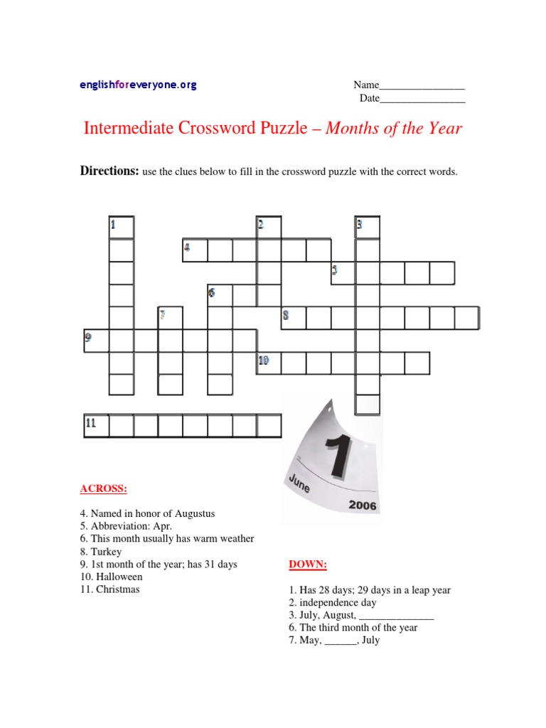 Intermediate Crossword Puzzle Months of The Year PDF PDF