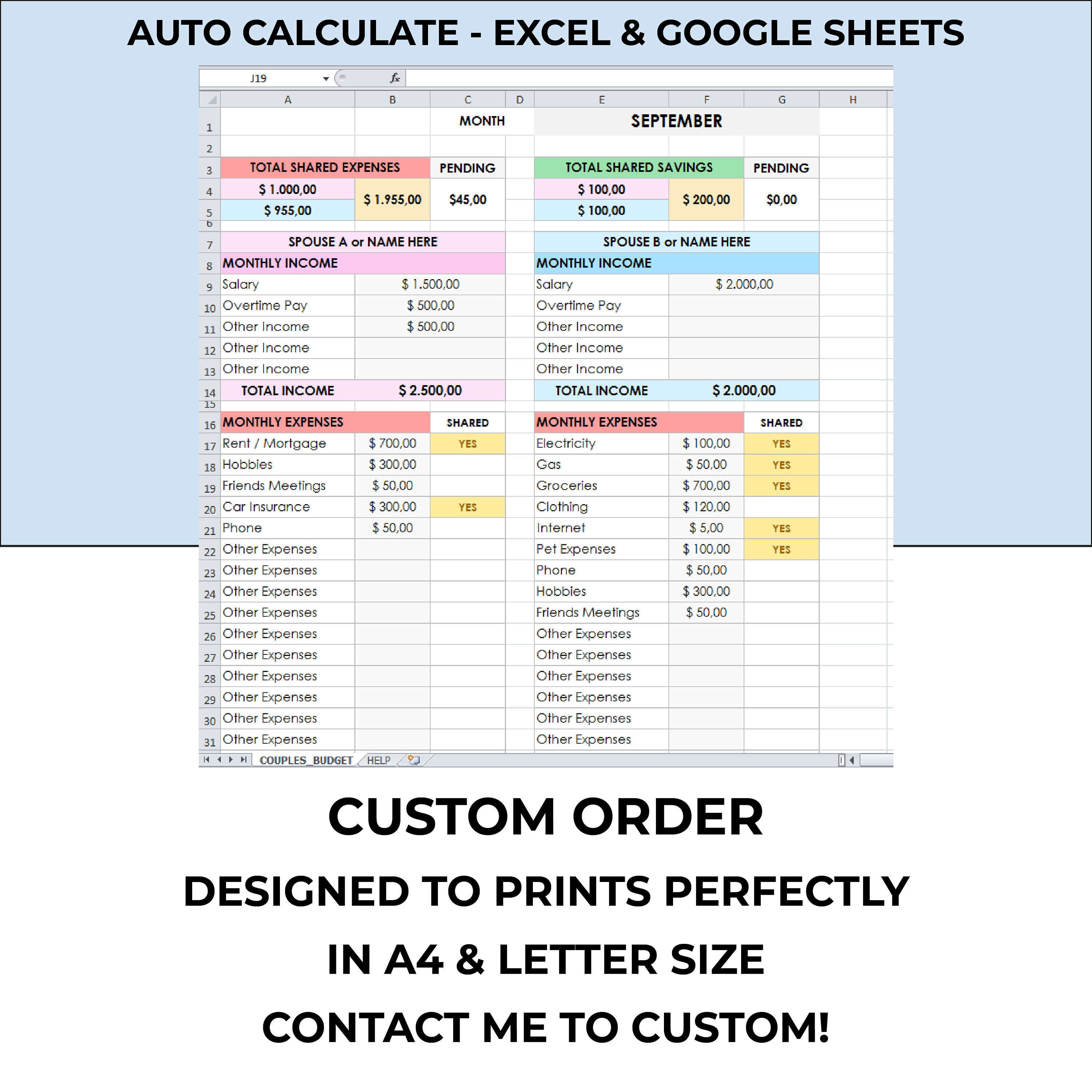 Couples Budget Spreadsheet Template: Monthly Shared Personal Expense