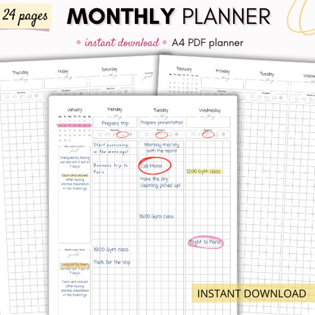 Mothly Planner Calendar PDF Monthly Plan Printable Digital Download