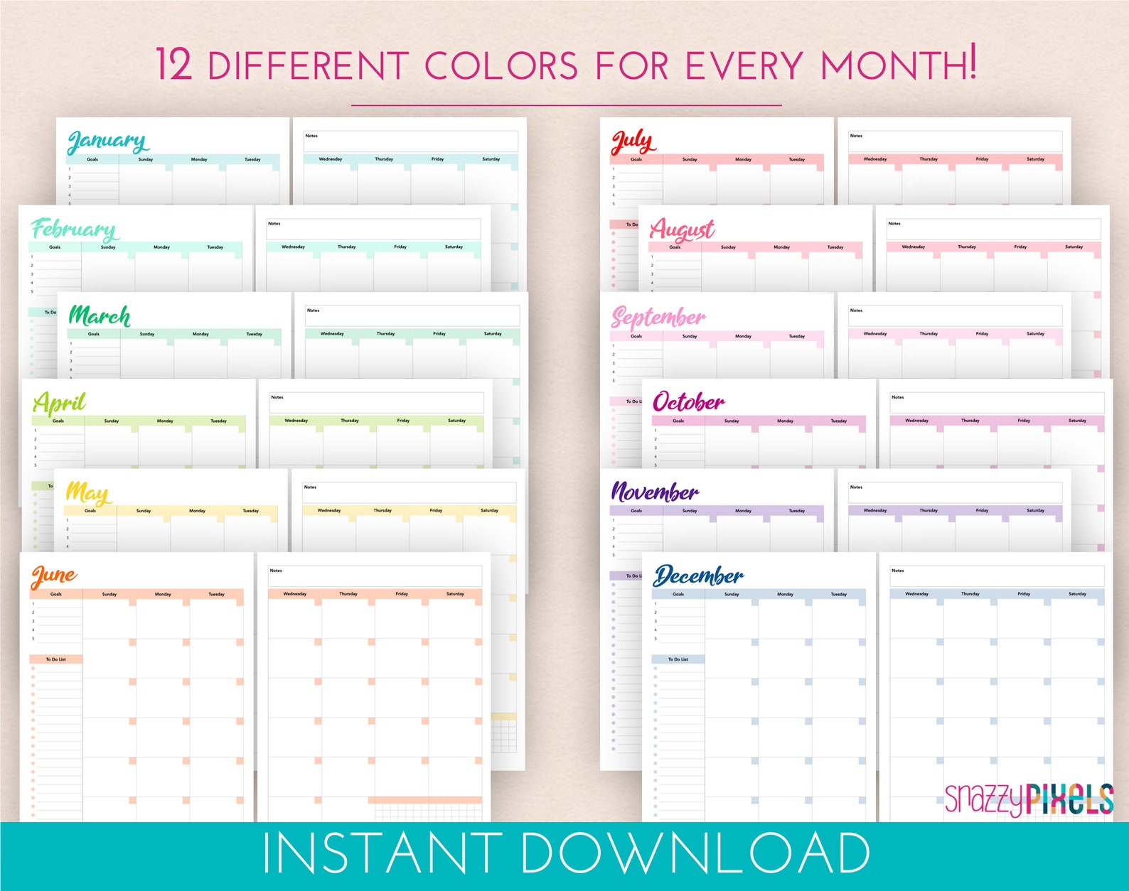 Monthly Planner Printable Year Calendar PDF Undated Template for