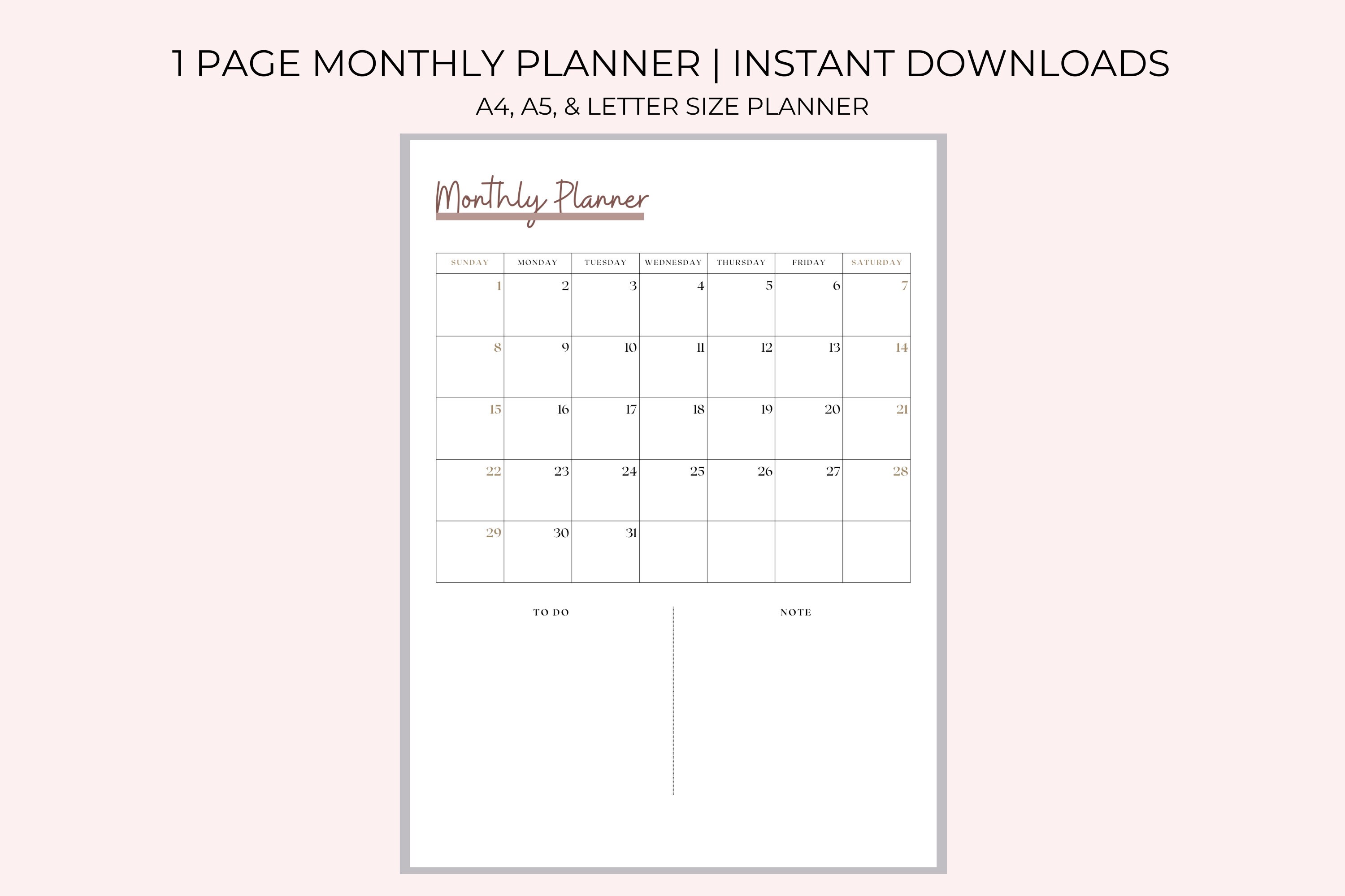 Monthly Planner Calendar PDF Digital Download Downloadable