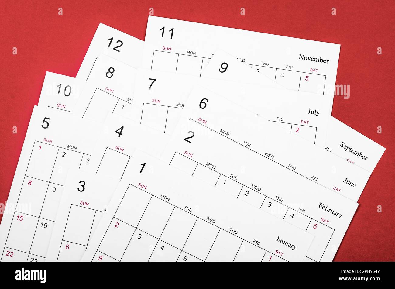 Many blank monthly calendar sheets on red background Stock Photo Alamy