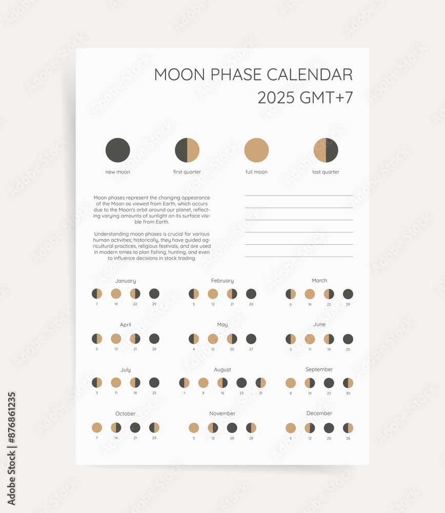 Lunar calendar lunar monthly cycle planner for 2025 year template