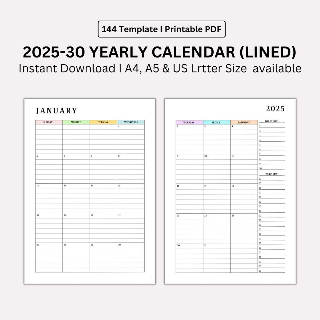 2025 to 2030 Monthly Lined Calendar Printable Dated Month on 2 Pages