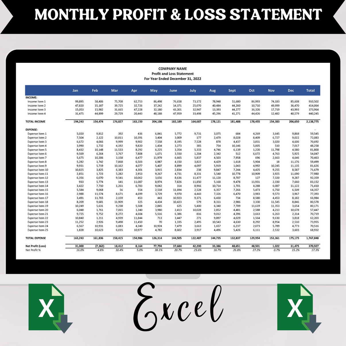 Monthly Profit and Loss Statement Excel Template P L Sheet Editable