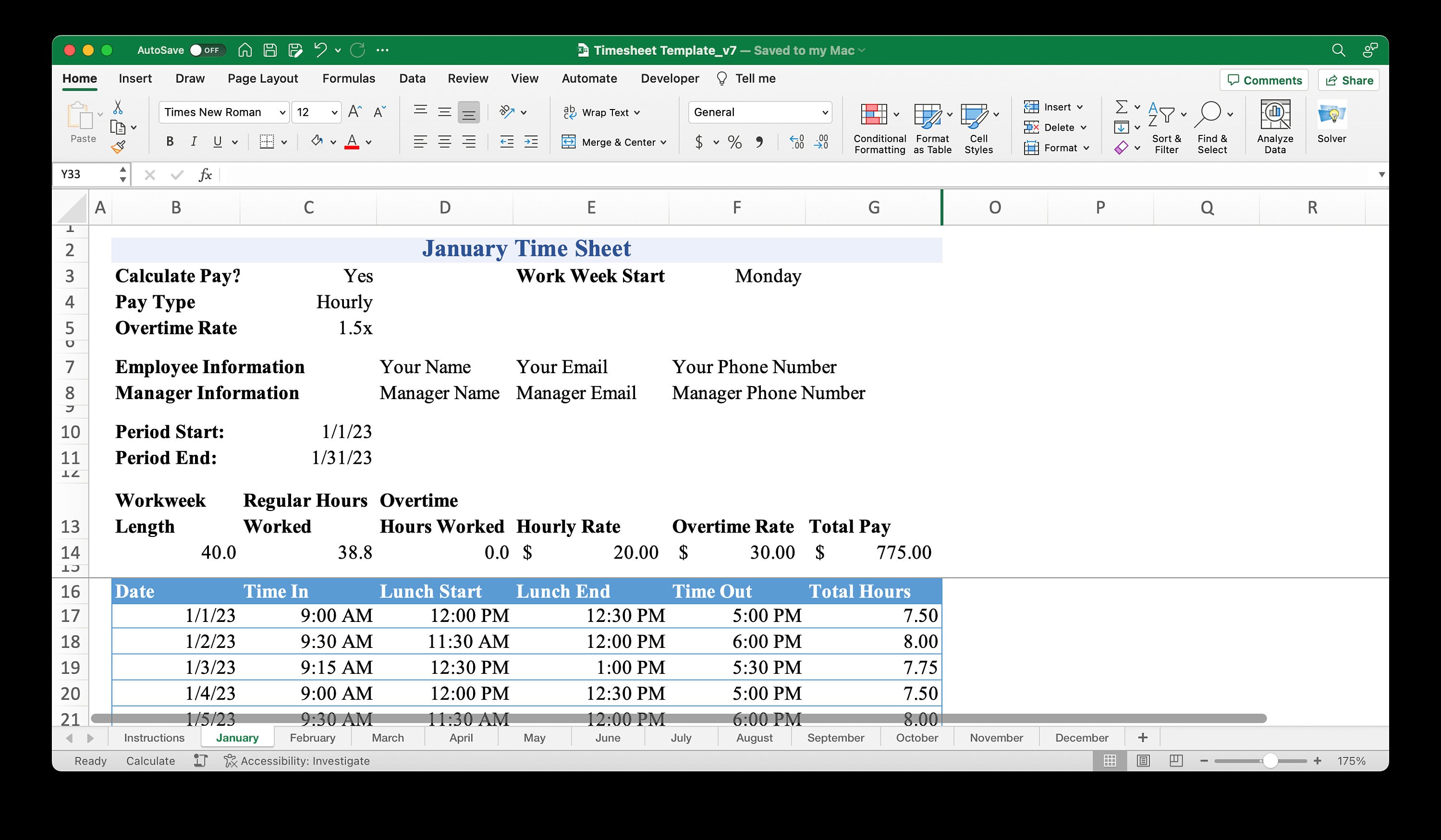 Monthly Timesheet Template Excel