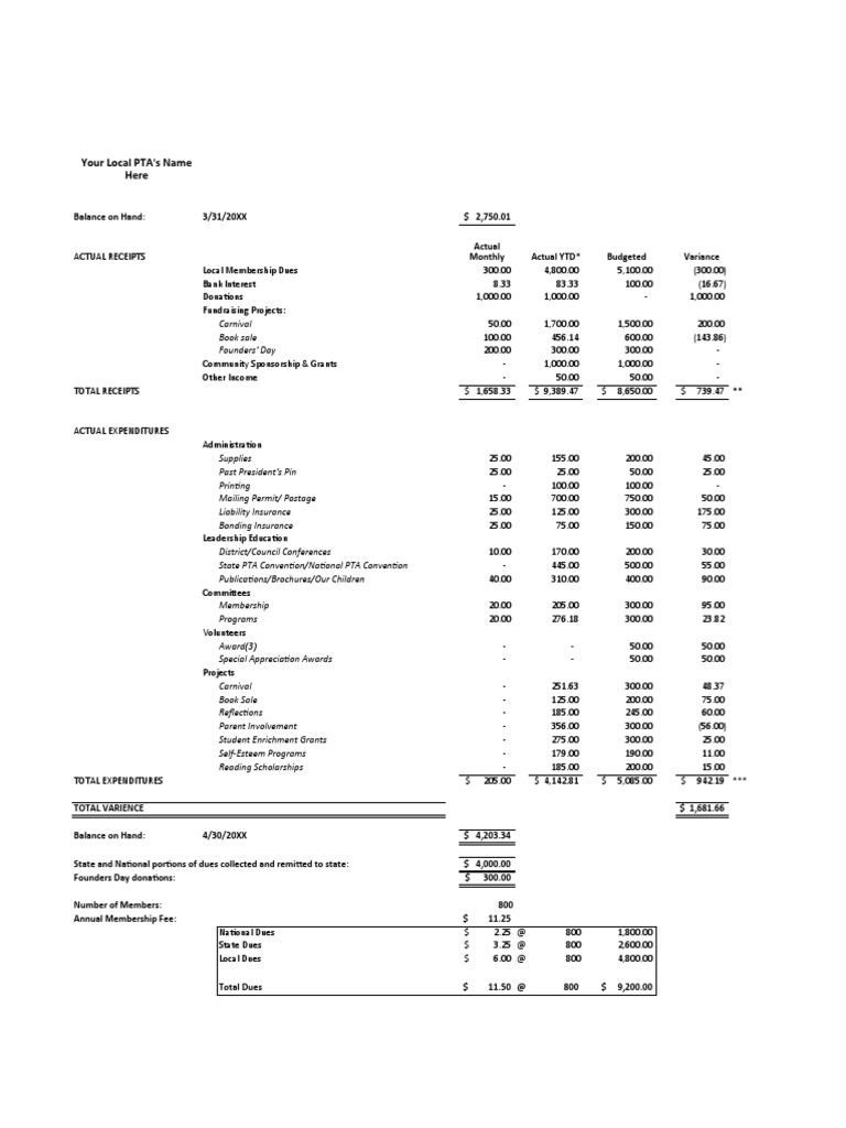 Treasurer Report Template Excel