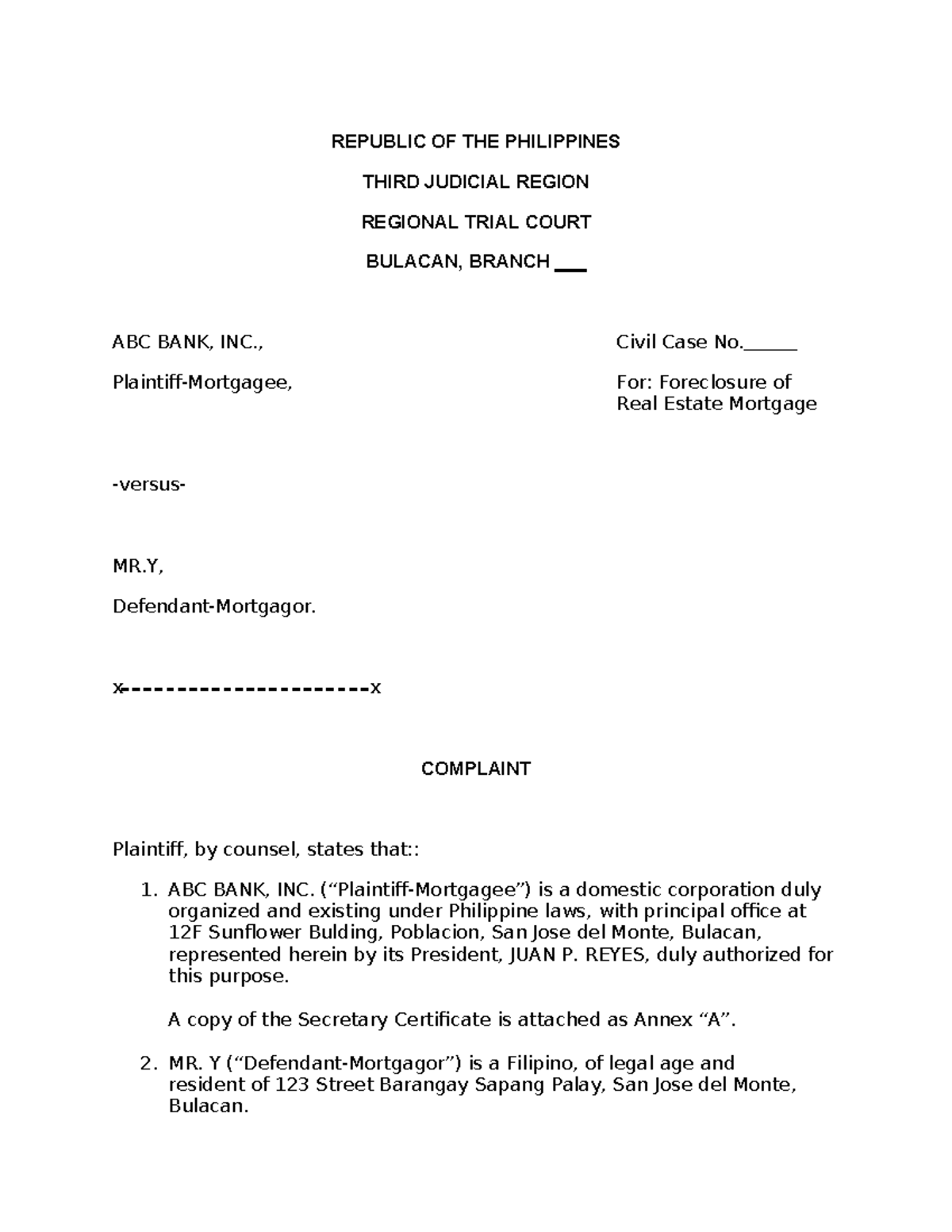 Civil Case No for Foreclosure of Real Estate Mortgage ABC Bank Inc