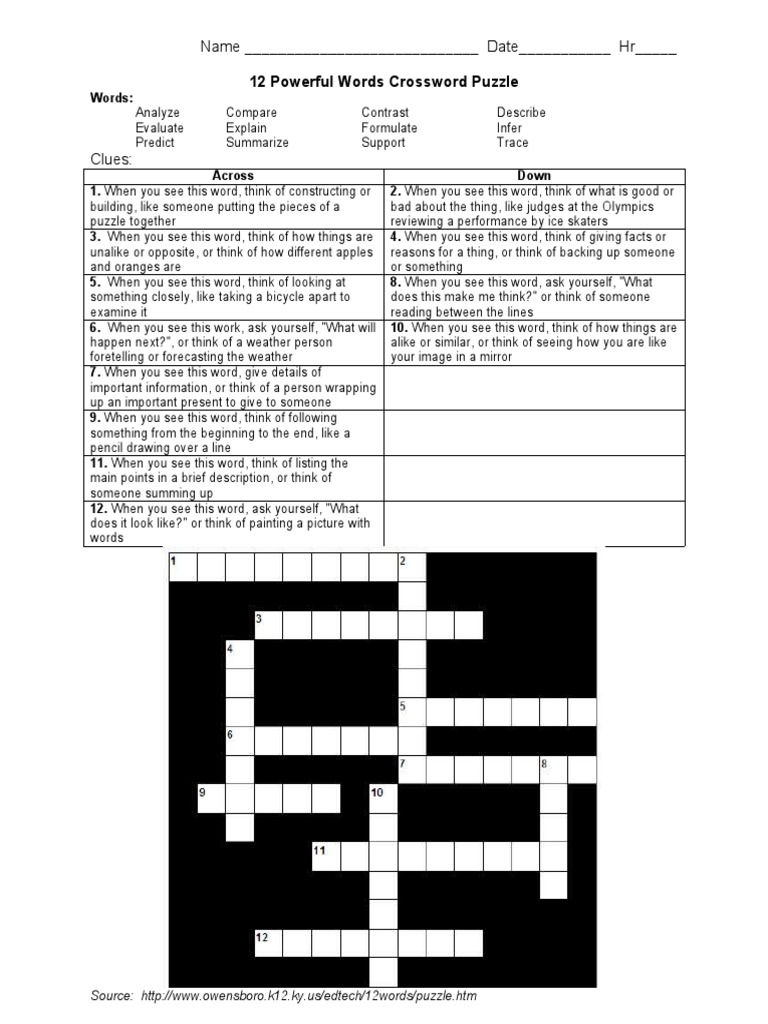 Name Date HR : 12 Powerful Words Crossword Puzzle PDF