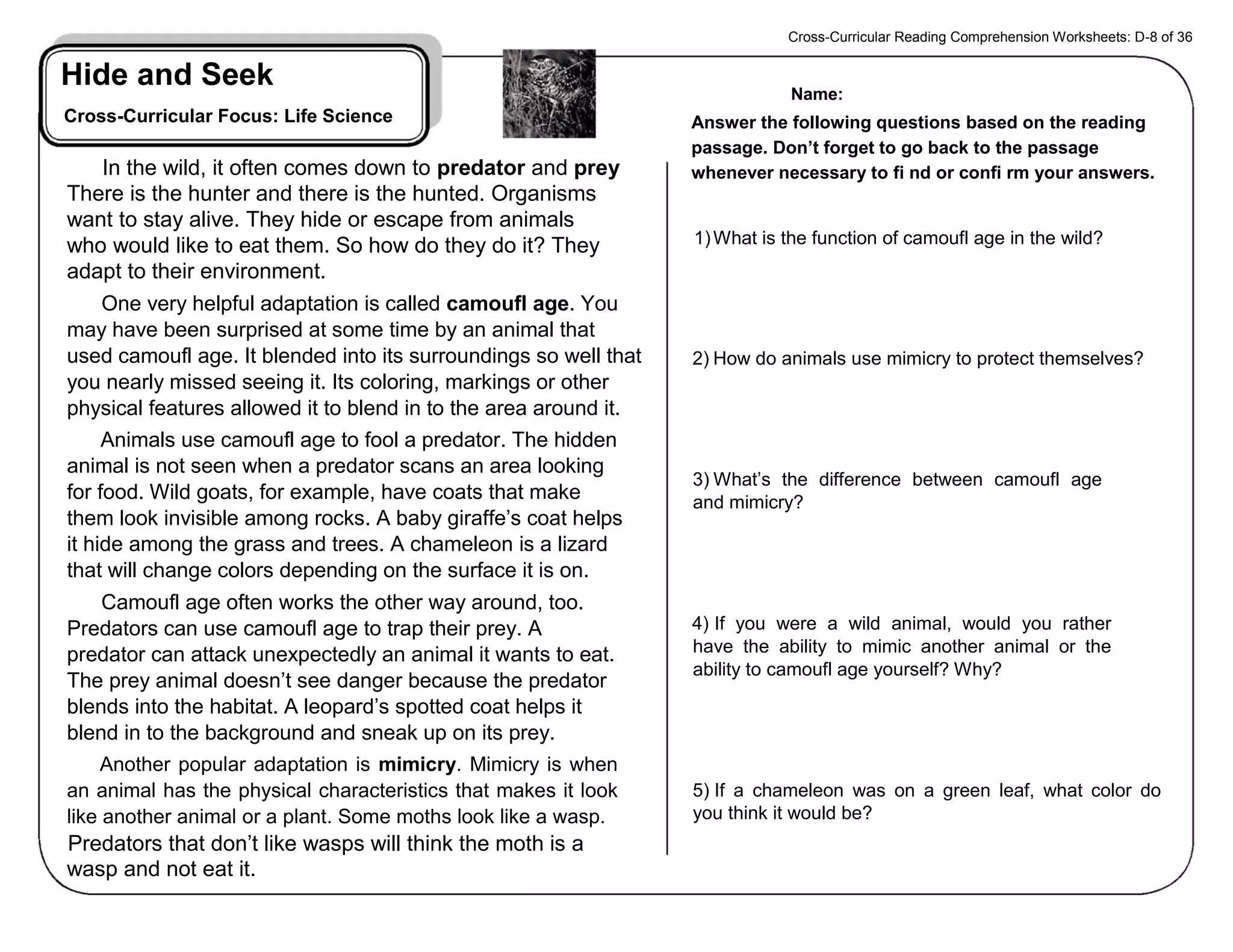 Mimicry Reading Science Story Comprehension Questions Worksheet