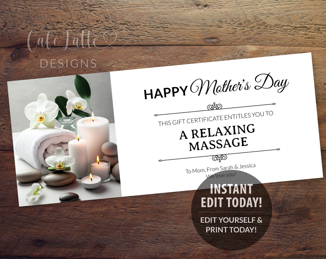 Mothers Day Massage Gift Certificate Editable Digital Template