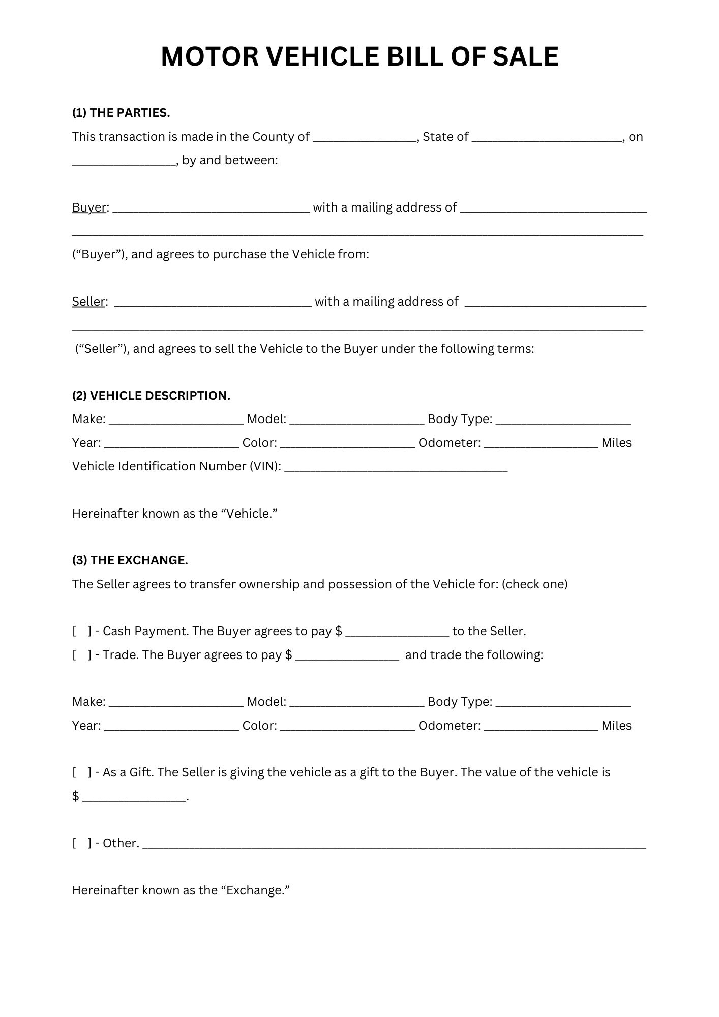 Printable Motor Vehicle Bill of Sale Template Easy DIY Legal Transfer
