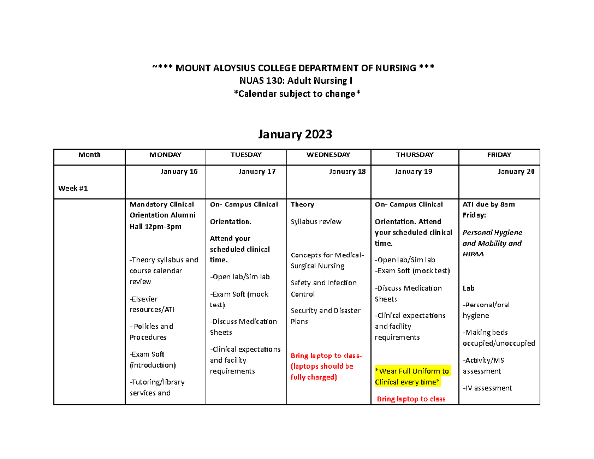 Spring 2023 NUAS 130 Calendar (2) ~*** MOUNT ALOYSIUS COLLEGE