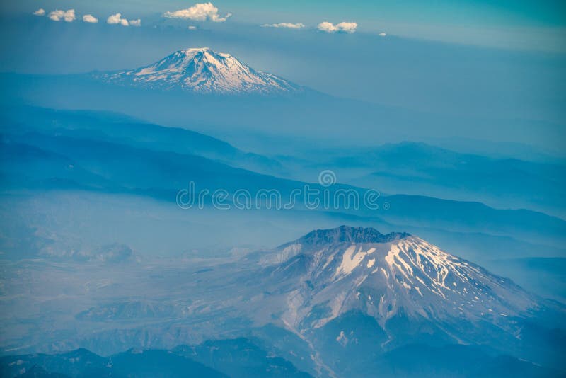 Aerial View of Mt St Helens and Mt Rainier from the Airplane Stock