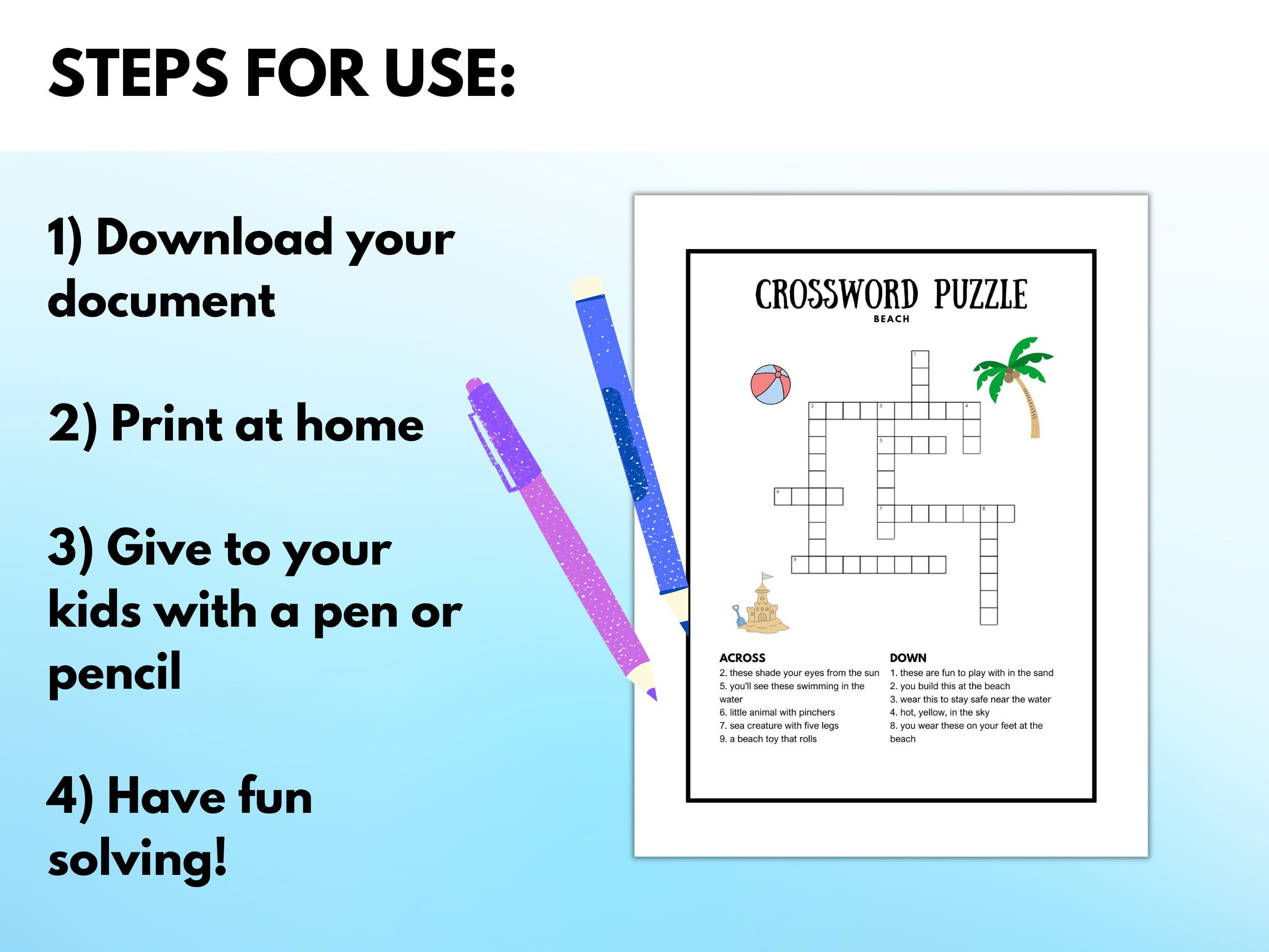 Crossword Puzzle for Kids With Beach Theme Starfish Crab and More