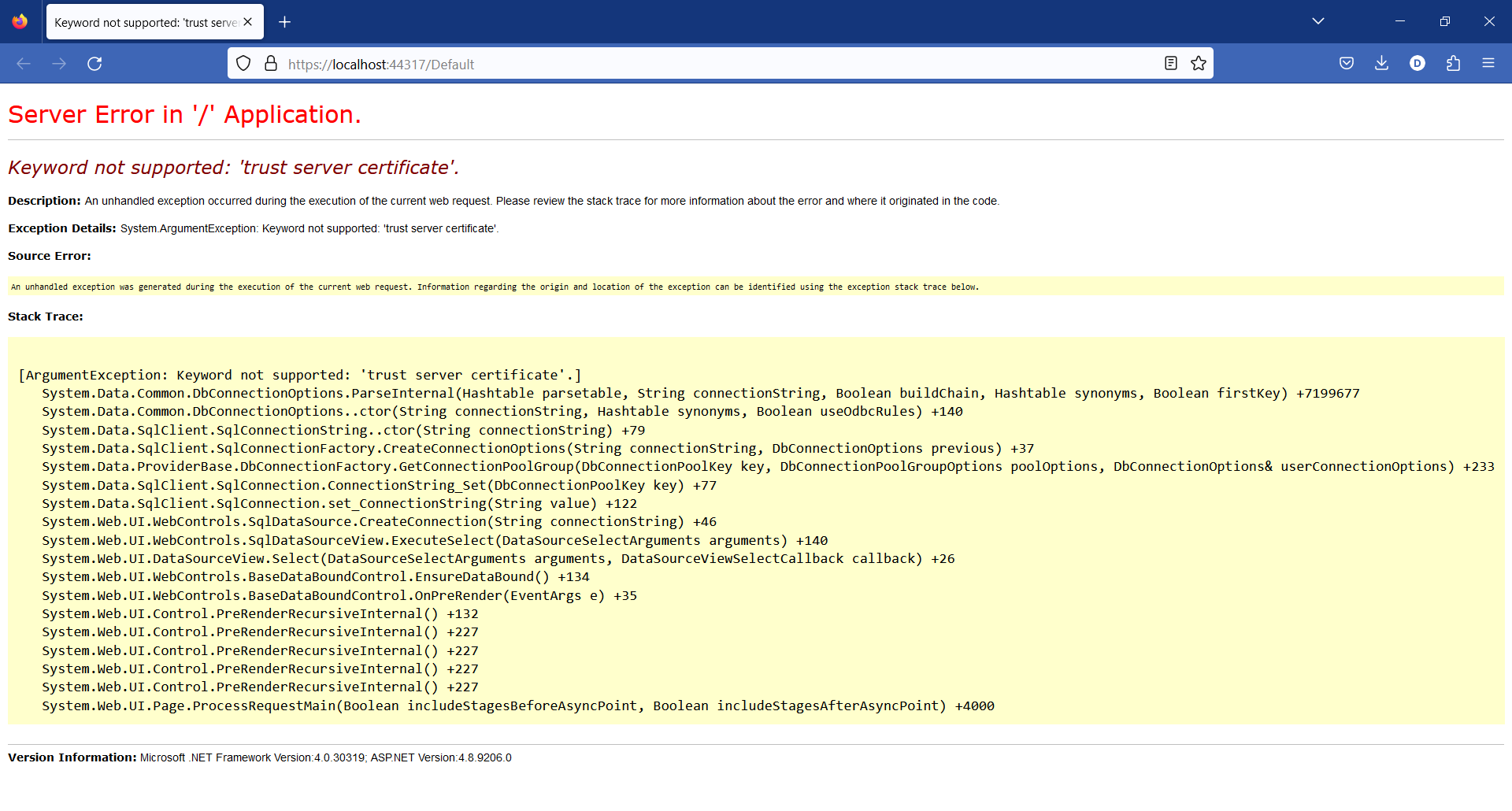 asp net Keyword not supported: #39 trust server certificate #39 error : r